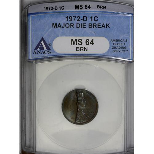 <B>1972-D<1C> Lincoln Cent--Major Die Break--MS64 Brown ANACS.</B></I> A huge die break swells above the obverse between 6:30 and 11:30. The left half of the reverse is sunken from metal flow to the break during the strike. Ocean-blue and tan-brown toning endow this satiny piece, which is undisturbed aside from a light curved mark on the left reverse depression.