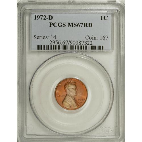 <B>1972-D 1C MS67 Red PCGS.</B></I> The design elements are crisply struck and the surfaces exude an astonishingly rich sheen of intense mint luster. Red-orange, steel-blue and purple-rose toning provide a feast for the eyes. Other than a few microscopic nicks, both sides of this Superb Gem Lincoln cent are pristine. PCGS Population: 10 in 67 Red, 0 finer at either service (3/07).<BR><BR><b>Shipping:</b> Coins & Currency (<a target="_blank" href="http://www.heritageauctions.com/common/shipping.php">view shipping information</a>)