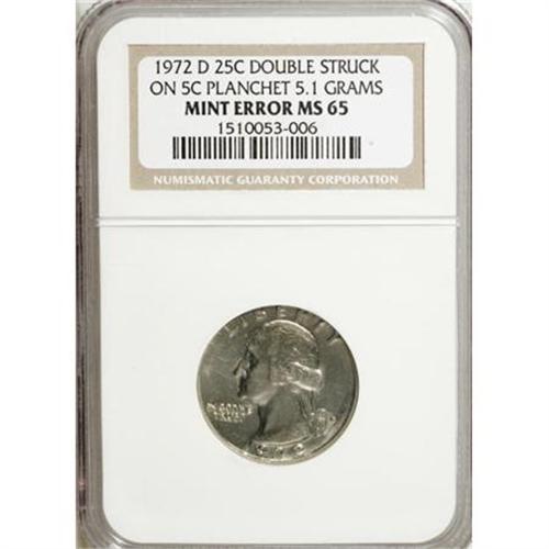 <B>1972-D 25C Washington Quarter--Double Struck on a 5C Planchet, 5.1 Grams--MS65 NGC.</B></I><BR><BR><B>Coin Engraver:</B> John Flanagan<BR><BR><b>Shipping:</b> Coins & Currency (<a target="_blank" href="http://www.heritageauctions.com/common/shipping.php">view shipping information</a>)