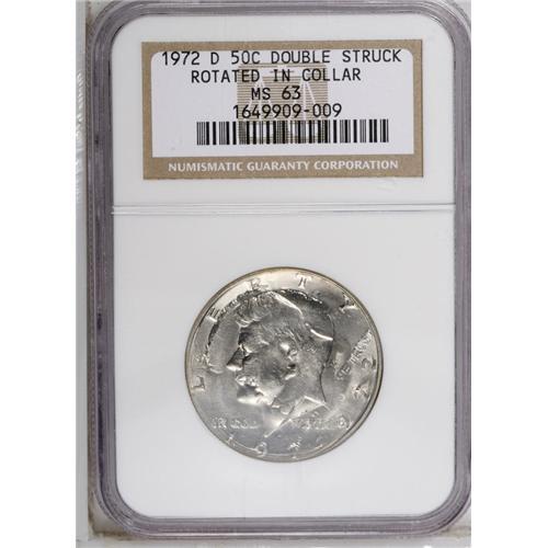 <B>1972-D 50C Kennedy Half Dollar--Double Struck, Rotated in Collar--MS63 NGC.</B></I> After the first strike, the coin rotated about 60 degrees counterclockwise inside the collar and was struck again. A flattened, ghostly profile of Kennedy echoes the relief portrait, and the formal eagle on the reverse has transformed into something like a cross between a crab and an octopus. Fully brilliant and lustrous with excellent eye appeal.<BR><BR><b>Shipping:</b> Coin/Currency (<a target="_blank" href="http://www.heritageauctions.com/common/shipping.php">view shipping information</a>)