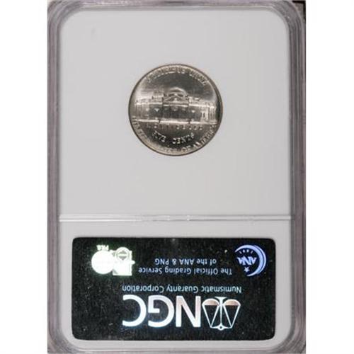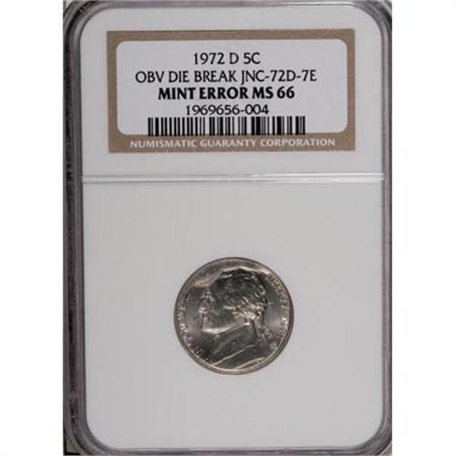 <B>1972-D 5C Jefferson Nickel--Obverse Die Break--MS66 NGC.</B></I> JNC-72D-7E. A huge cud occupies the obverse border between 9:30 and 1 o'clock, swallowing TRUST and the top of Jefferson's hair. The cud presses against his forehead. The strike is soft on the reverse between 5 and 8 o'clock, as expected due to metal flow into the big die break. The obverse has a pair of small gray spots.<BR><BR><B>Coin Engraver:</B> Felix Schlag<BR><BR><b>Shipping:</b> Coins & Currency (<a target="_blank" href="http://www.heritageauctions.com/common/shipping.php">view shipping information</a>)