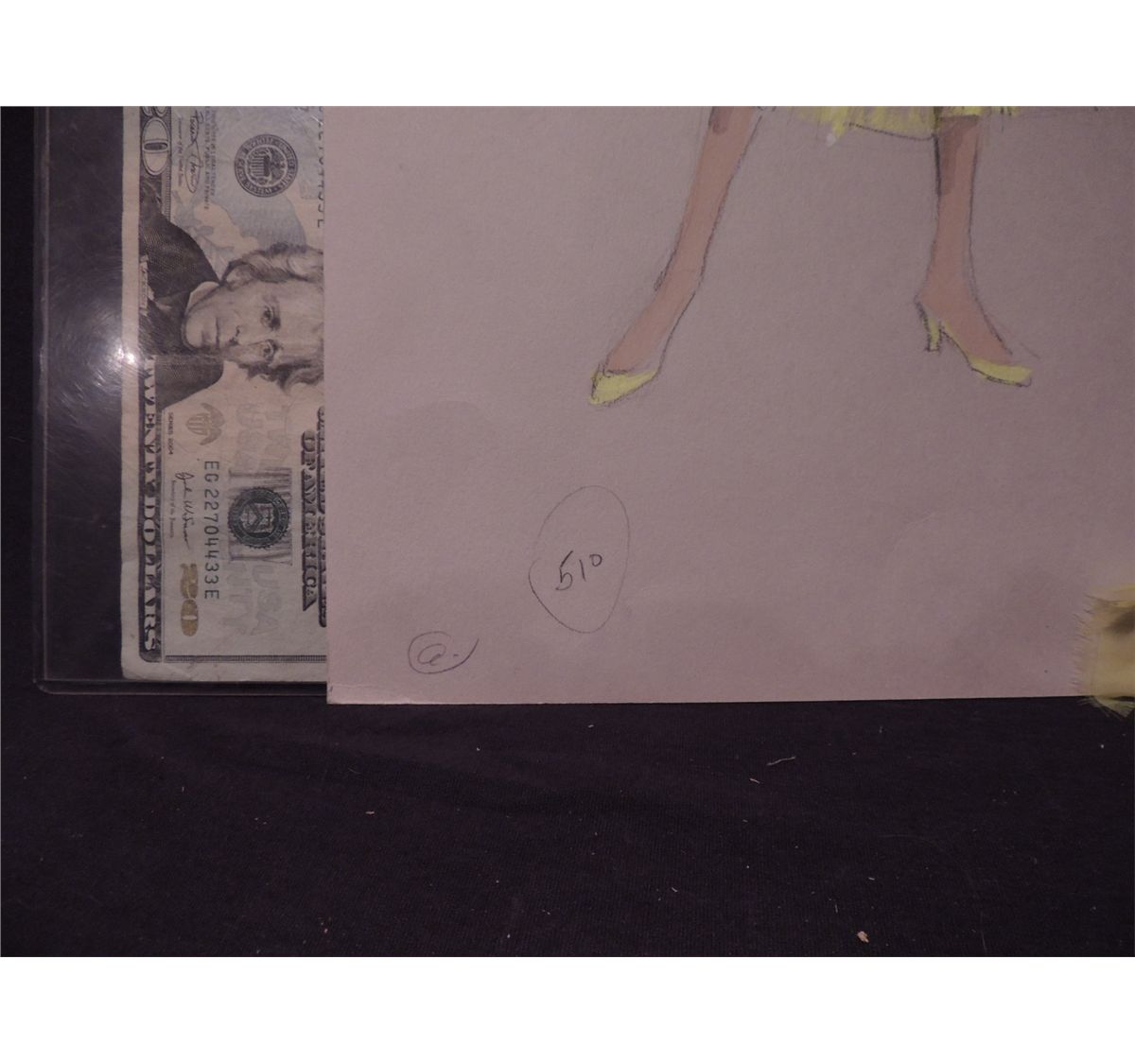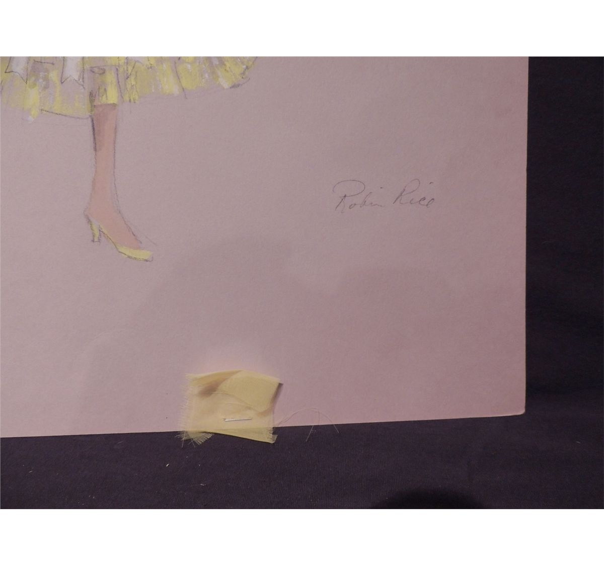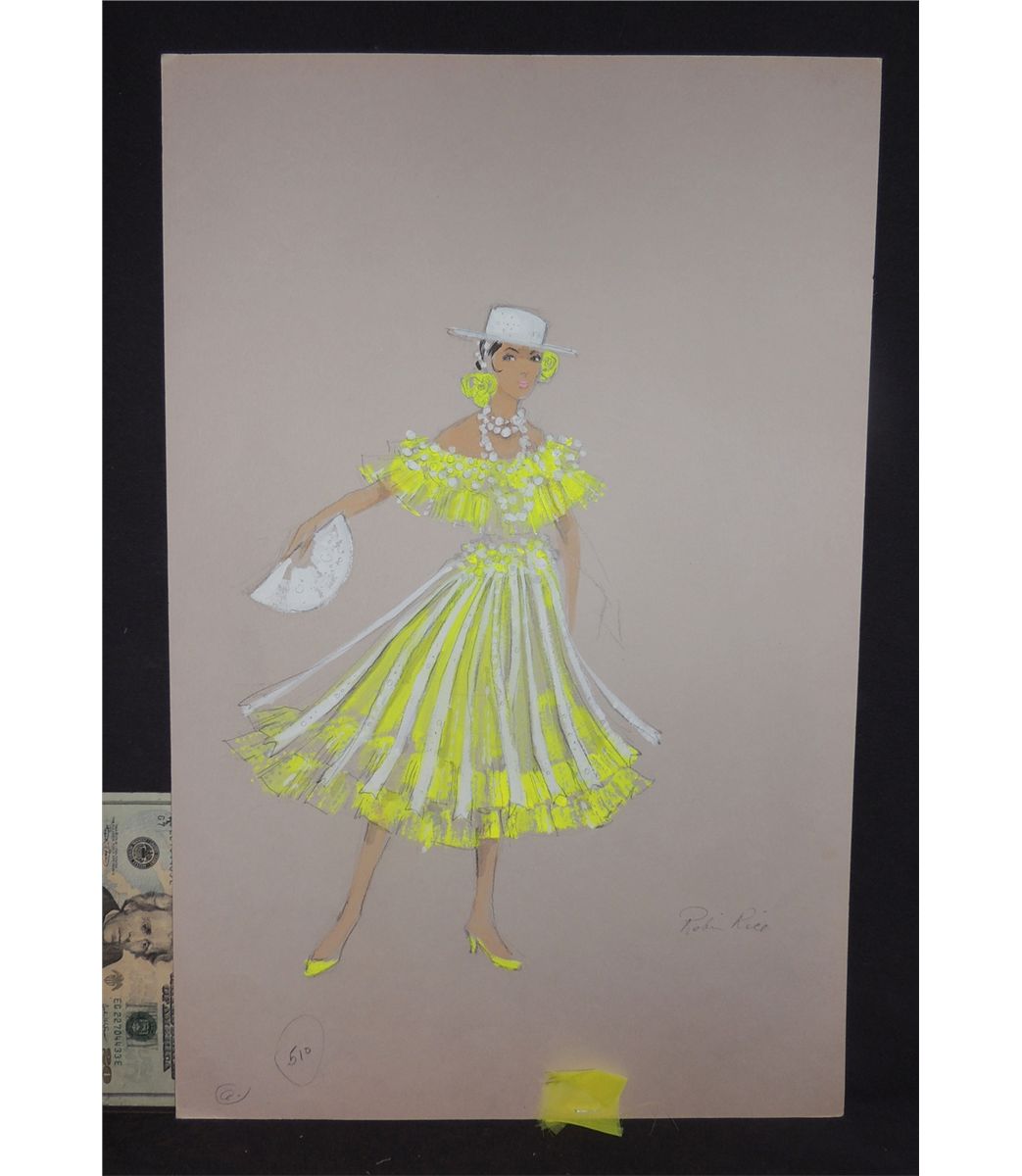 This one is of a complete Spanish dancer wardrobe in yellow with white hat and gloves for The Three Caballeros stage performances. This has a few notes by the artist, and a small piece of the actual fabric attached to it. This is the only one that has fabric, and is the only one clearly signed on the bottom right by the artist, Robin Rice.