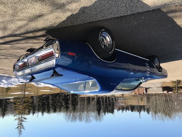Stock body has had a professional rotisserie restoration completed in 2008, all rusty metal replaced with new metal panels, rear quarters, floors, etc all new. -all is straight with very good alignment, body has the hide-away lights, raised ralley hood, vinyl roof and a rear spoiler. -Paint is the code GB5 Bright Blue metallic, all areas of inner doors, under floors hood, trunk all refinished with base/clear coat to a very good quality. -Trim, grill, headlight covers, taillights bezel, chrome bumpers, f. r. bumperetts, dual chrome mirrors with dr. remote, wheel well rocker trim, emblems all in exc. cond. -Trunk has rubber matt with stereo equipment mounted, owner has jack spare, all in exc. cond.
