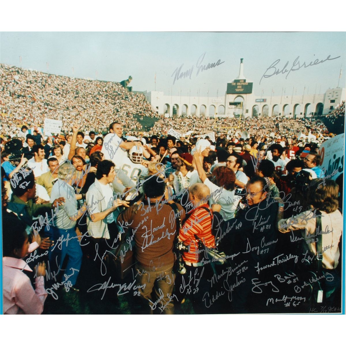 Fantastic oversized photo of the 1972 Dolphin Undefeated team celebrating their winning season. Signed by team in silver marker photo 16 x 20.