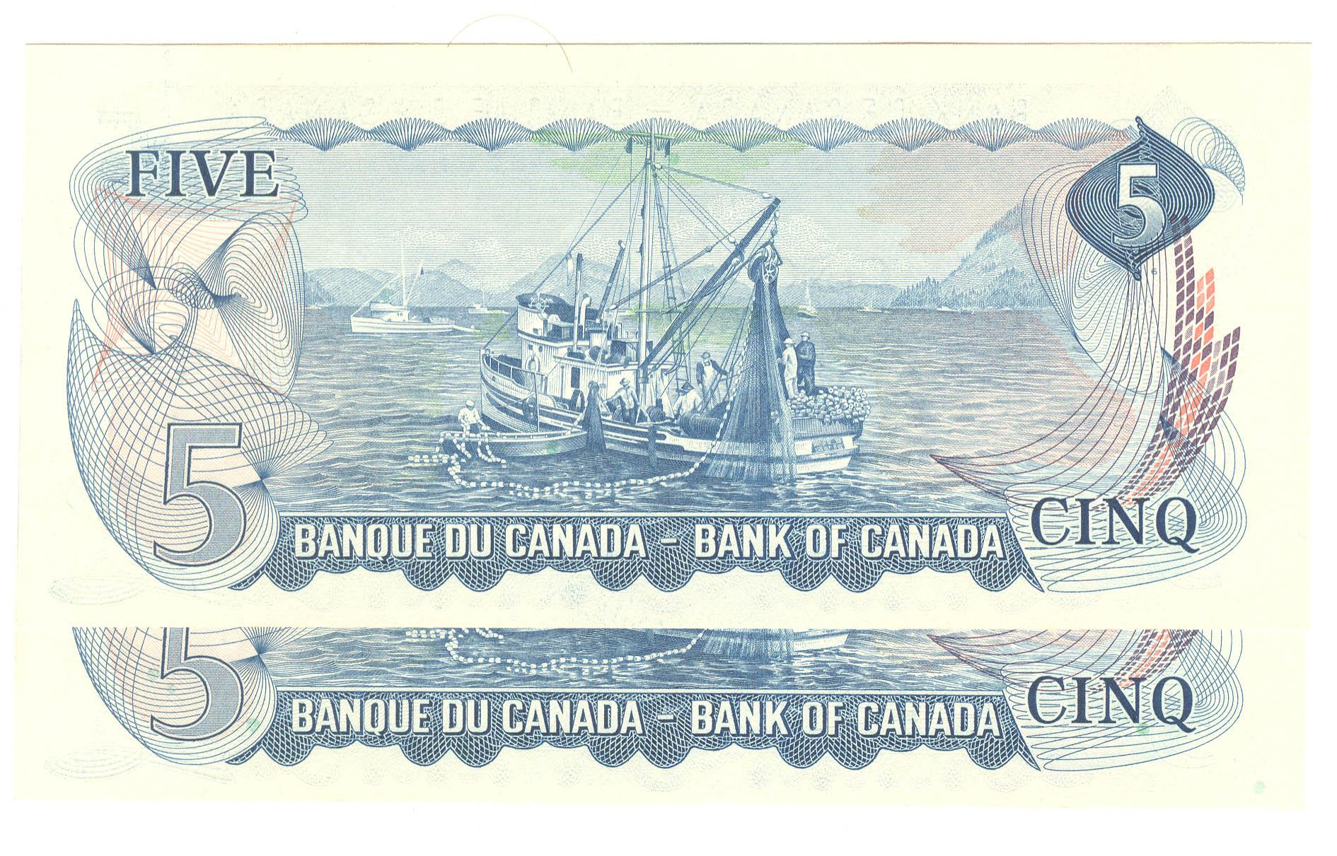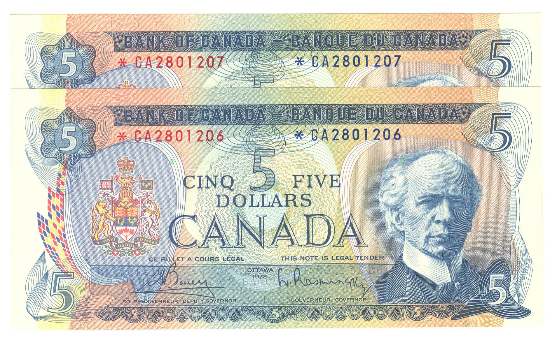 1972 Five Dollars Pair of consecutive Replacement, BC-48aA, GEM UNC, Bouey Rasminsky, serial *CA2801206-07.