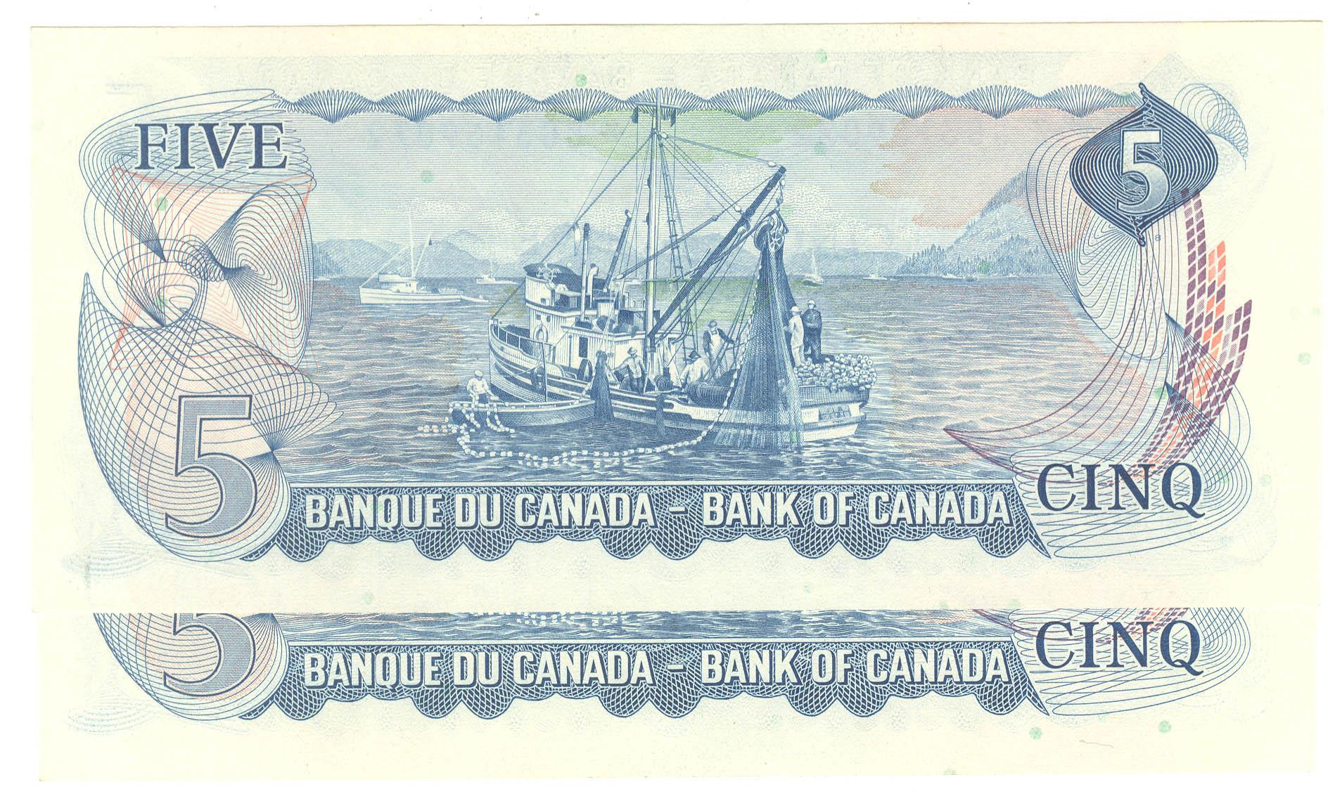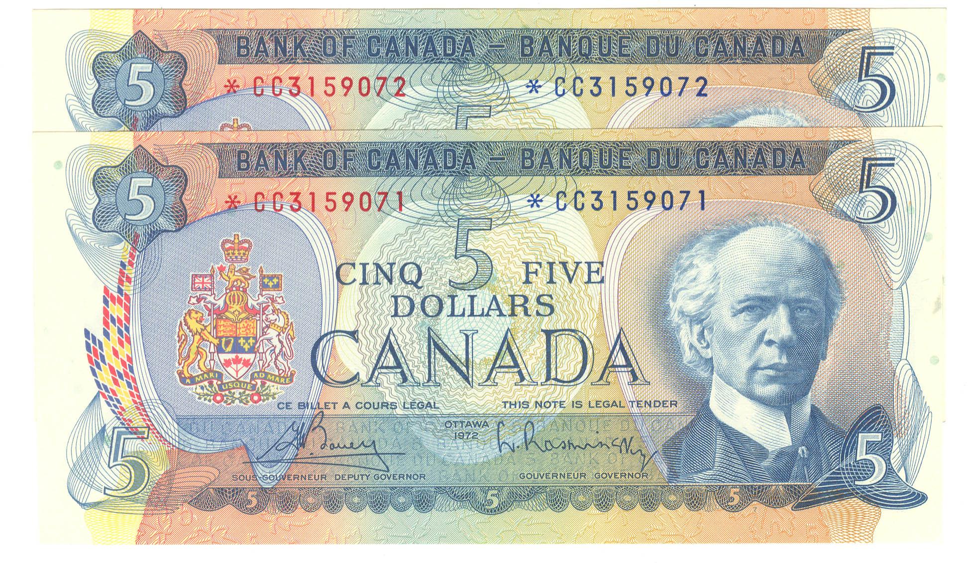 1972 Five Dollars Pair of consecutive Replacement, BC-48aA, GEM UNC, Bouey Rasminsky, serial *CC3159071-72.
