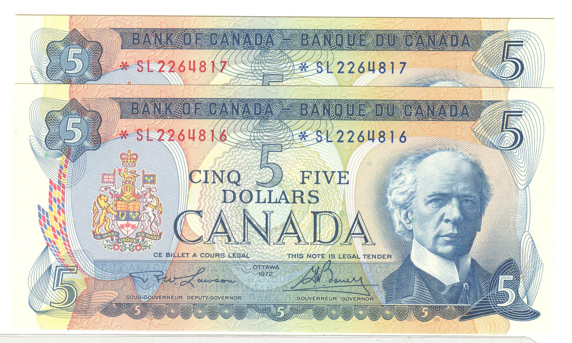 1972 Five Dollars Pair of consecutive Replacement, BC-48bA, GEM UNC, Lawson Bouey, serial *SL2264816-17.