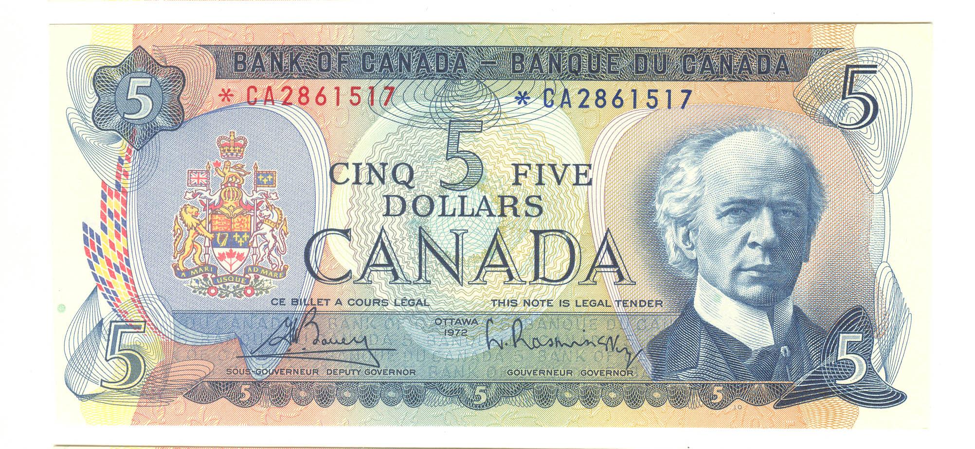 1972 Five Dollars Replacement, BC-48aA, Choice UNC, Bouey Rasminsky, serial *CA2861517.