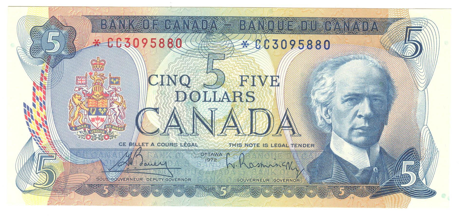1972 Five Dollars Replacement, BC-48aA, GEM UNC, Bouey Rasminsky, serial *CC3095880.