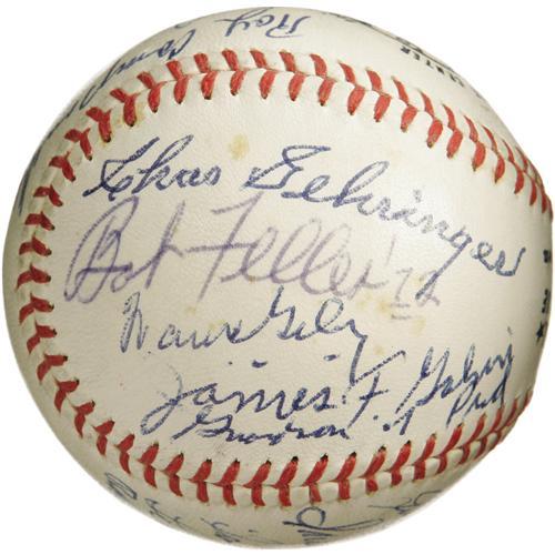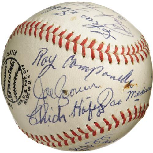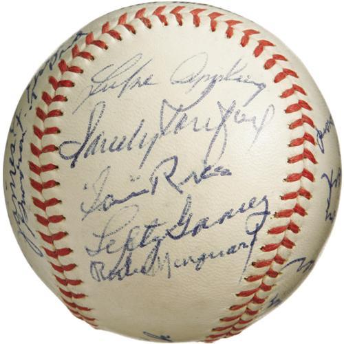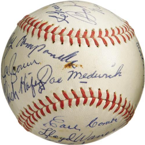 <B>1972 Hall of Famers Multi-Signed Baseball.</B></I> Birthed at the 1972 Cooperstown induction ceremonies, this ONL (Feeney) ball provides more star power than you could shake a Louisville Slugger at. Presenting in 9/10 and better blue ink are Appling, Koufax, Rice, Gomez, Marquard, Medwick, Hafey, Cronin, Campanella (secretarial), Gehringer, Feller, Giles, Combs, Lloyd Waner, Grove Frisch, Leonard and Pud Galvin's grandson. A couple scattered spots of foxing are mentioned only for the sake of accuracy. A special sphere that will only continue to grow in value and intrigue with each passing year. <I>LOA from PSA/DNA. LOA from James Spence Authentication.</B></I><BR><BR><b>Shipping:</b> Balls, Pucks, etc., Small (<a target="_blank" href="http://www.heritageauctions.com/common/shipping.php">view shipping information</a>)