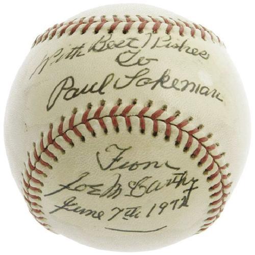 <B>1972 Joe McCarthy Single Signed Baseball.</B></I> He called the shots for everyone from Cuyler and Hornsby to Ruth and Gehrig to Williams and Doerr, notching a remarkable 2,125 career victories against just 1,333 defeats. Yet managers, however great, just never tended to inspire autograph requests, leaving collectors of Hall of Fame singles battling for the short supply. Here we offer a heavily inscribed "Official League" ball, penned entirely in the eighty-five year old legend's hand. Unbelievably bold black ink reads, "With Best Wishes to Paul Lakeman, From Joe McCarthy, June 7th, 1972." A light brushing of shellac has been applied over the inscription and autograph, yellowing just a fraction of a shade but preserving the ink in flawless condition. <I>LOA from PSA/DNA. LOA from James Spence Authentication.</B></I><BR><BR><b>Shipping:</b> Balls, Pucks, etc., Small (<a target="_blank" href="http://www.heritageauctions.com/common/shipping.php">view shipping information</a>)