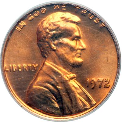 1972 Lincoln Cent. Doubled die obverse. PCGS graded MS-66 Red. Old Green Holder. A lovely choice gem example. Pop 481; 17 finer, 16 in 67, 1 in 68 (PCGS # 2950) .