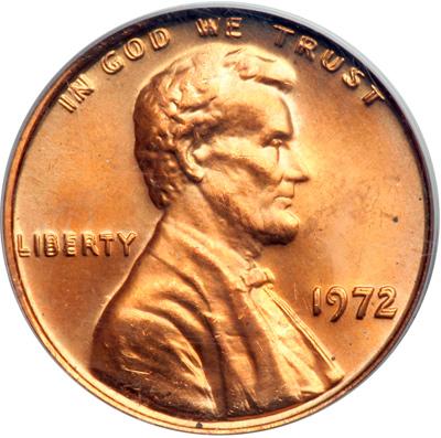 1972 Lincoln Cent. Doubled die obverse. PCGS graded MS-66 Red. A lovely gem and an exemplary coin whose lustrous surface rolls in rich color. A precision strike on every device. In terms of originality, this 1972 doubled die cent is exactly like one of those coins which arise from an original roll: pristine and spot-free, and finer by far than 90% of the others in existence. Pop 481; 17 finer, 16 in 67, 1 in 68 (PCGS # 2950) .