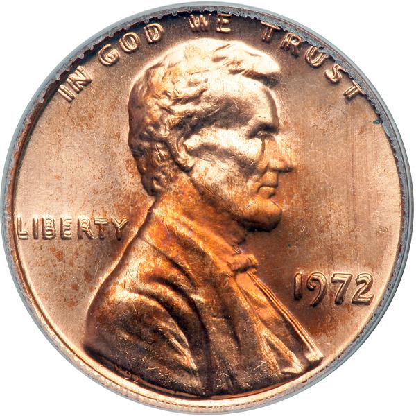 1972 Lincoln Cent. Doubled die obverse. PCGS graded MS-66 Red. Almost fully red. Slight toning on both sides. Pop 484; 17 finer (PCGS # 2950) .