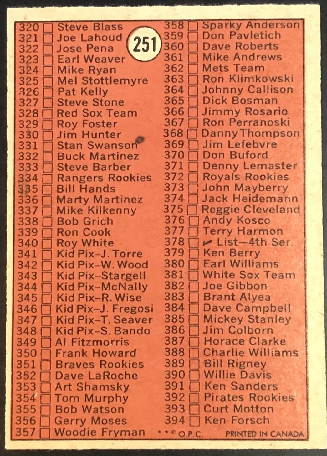 Card #251 OPC, vintage, MLB, baseball
