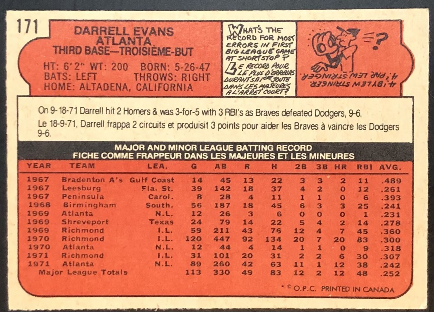 Card #171 OPC, vintage, MLB, baseball, rookie