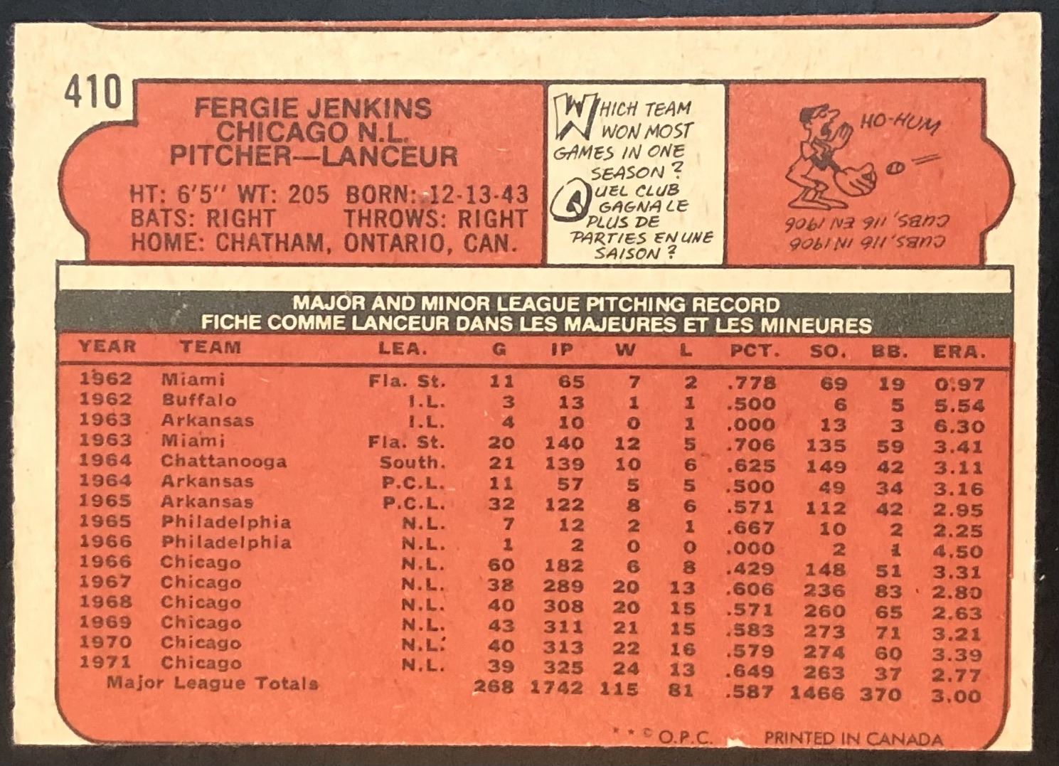 Card #410 MLB, baseball, vintage, OPC, hall of fame