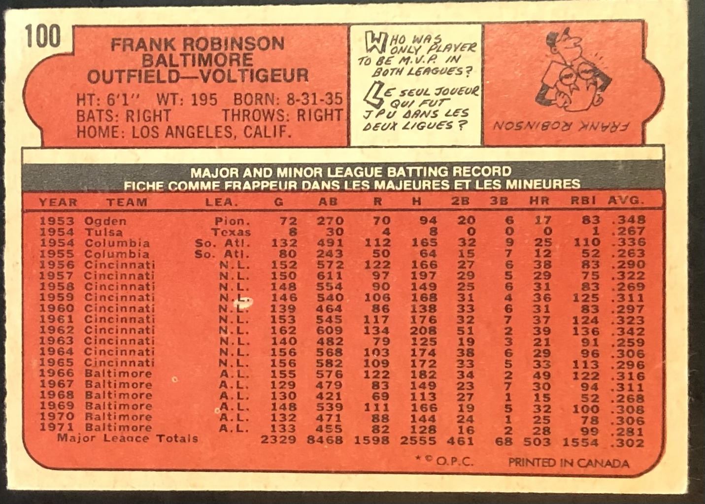 Card #100 OPC, vintage, MLB, baseball, hall of fame