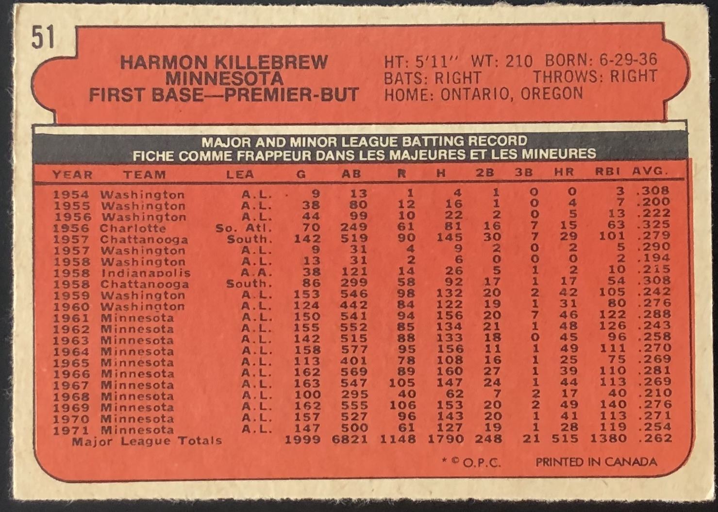 Card #51 OPC, vintage, MLB, baseball, hall of fame