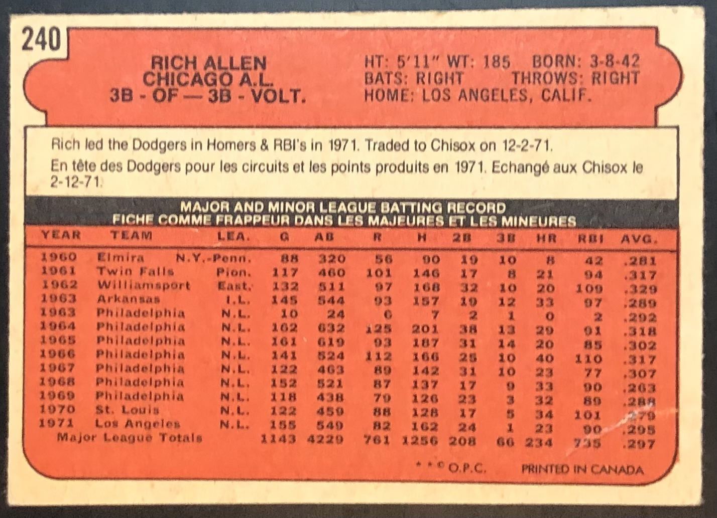 Card #240 vintage, MLB, baseball, hall of fame, OPC