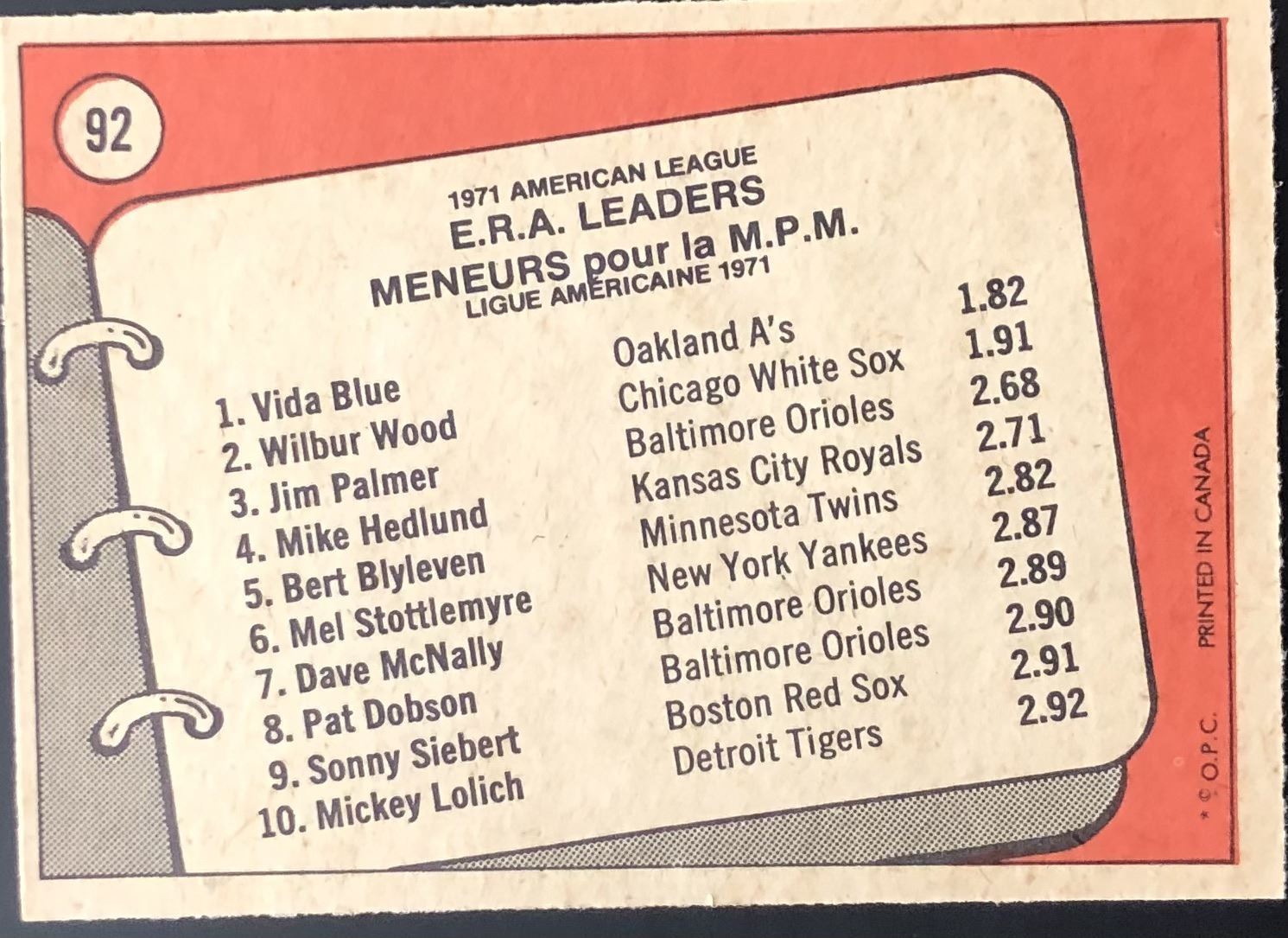 Card #92 MLB, baseball, vintage, OPC, hall of fame