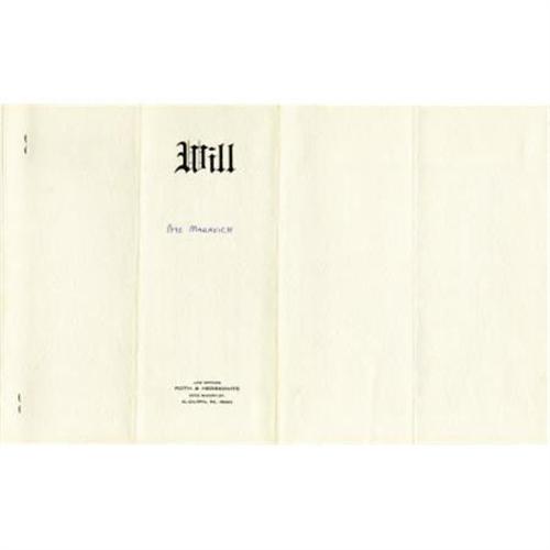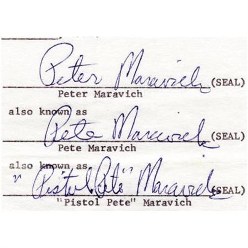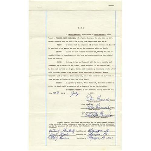 <B>1972 Peter Maravich Triple-Signed Last Will & Testament.</B></I> Just twenty-five when he signed this brief legal document bequeathing his possessions to friends and family, the young superstar couldn't possibly have imagined that the end would come so soon. Though a later will would replace this one, the poignance of this offering is impossible to miss, as Pistol Pete would be struck down at the youthful age of forty while playing the game he loved. Beyond that extraordinary appeal, autograph collectors will thrill at the sight of three variations of Maravich's signature, stacked near the bottom of the single page document in 9/10 and better blue ink. Signatures of three witnesses appear below. The page itself measures 8.5x13.5, and remains in flawless condition, with original storage folds, and is stapled to a sleeve from the law offices of Roth & Herskovitz in Aliquippa, PA. One of the most interesting and important Maravich documents to surface in the hobby market in quite some time. <I>LOA from PSA/DNA. LOA from James Spence Authentication.</B></I><BR><BR><b>Shipping:</b> Flat Material, Large (<a target="_blank" href="http://www.heritageauctions.com/common/shipping.php">view shipping information</a>)