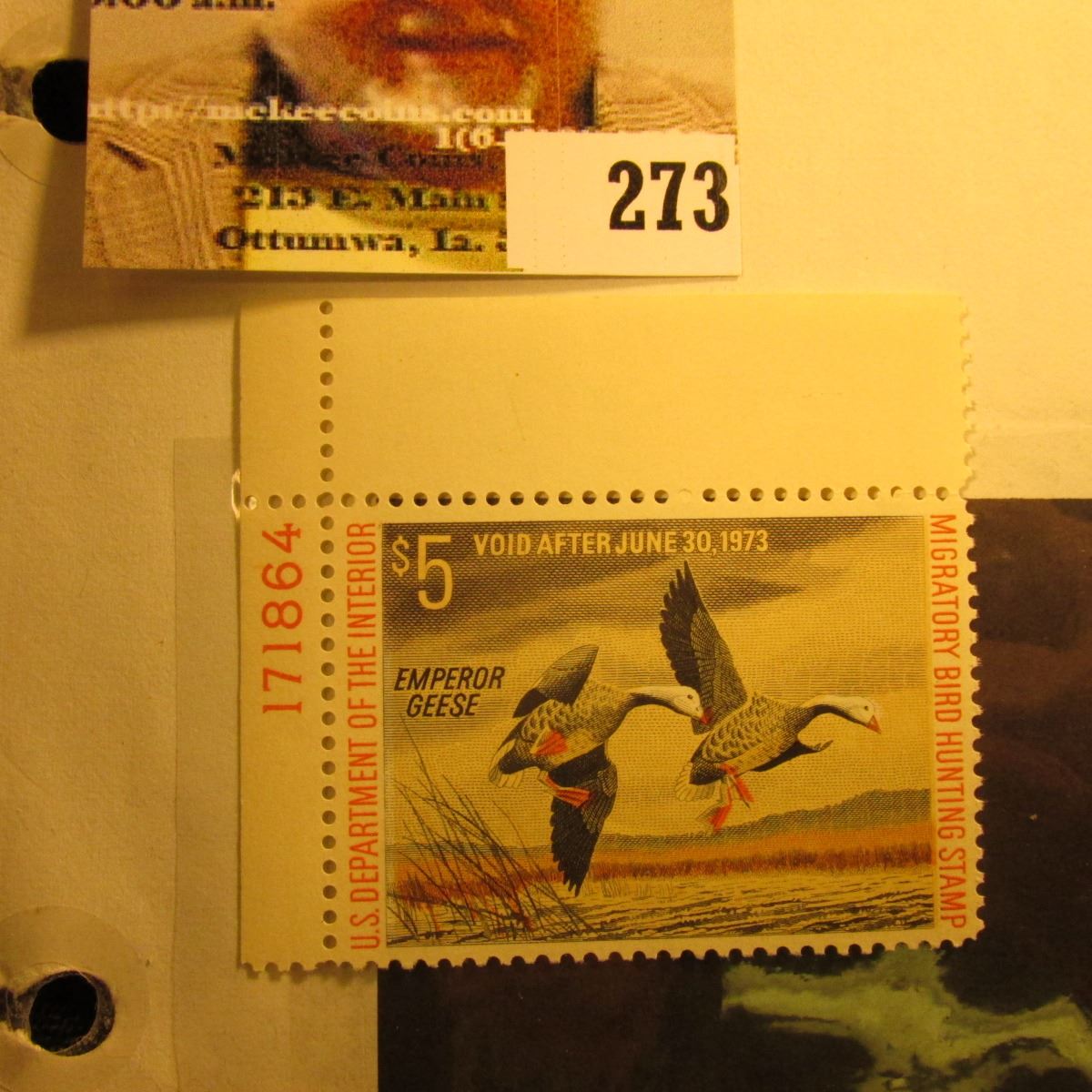 1972 RW39 Federal Migratory Bird Hunting $5 Stamp, unsigned, original gum, depicts a pair of Emperor Geese. Plate number single.