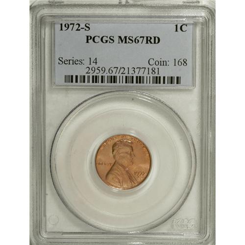 <B>1972-S 1C MS67 Red PCGS.</B></I> The deep red-gold toning and intense satin luster across each side of this conditionally scarce Lincoln cent ensure its high level of eye appeal. Well struck save for microscopic incompleteness on STATES OF and E on the upper reverse. Population: 14 in 67 Red, 0 finer (3/07).<BR><BR><b>Shipping:</b> Coins & Currency (<a target="_blank" href="http://www.heritageauctions.com/common/shipping.php">view shipping information</a>)