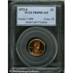 1972-S 1C PR69 Deep Cameo PCGS. Rich cherry-red pa <B>1972-S 1C PR69 Deep Cameo PCGS.</B></I> Rich cherry-red patina blankets the deeply cameoed features. The devices are splendidly frosted, especially on the obverse. Sharply struck and free of contact marks, with numerous tiny flyspecks on obverse and reverse alike, which are barely visible without a magnifier. Population: 52 in PR69 Deep Cameo, 0 finer (11/04). <BR><BR><B>Important notice:</B> Heritage usually auctions material at the rate of 200-250 lots per hour. On some occasions eBay Live bid software or the Internet may not be able to keep up with the pace of the auction. We recommend placing a realistic absentee bid now as insurance to avoid disappointment. Occasionally the auctioneer may eliminate or reject an eBay Live bid, and the auctioneer may also reopen a lot after the close of the eBay live bidding (usually because we missed an audience bid), and may reject your bid even if it shows you as the winning bidder. By bidding via eBay Live, you agree that Heritage may award the lot to another bidder at its sole discretion under the circumstances described above or any other reasonable circumstances. Since eBay bids are not shown to us until we open the lot on the floor, we treat those bids just like floor bids. In most cases the floor responds before the eBay bid is presented to us, due to Internet lag time, so for consistency we have made it a policy that floor bids are always considered first over tie eBay live bids. Also please note that all Heritage lots purchased through eBay Live carry a 20% Buyer's Premium. Please make sure you read the Terms and Conditions before you bid. This lot is being auctioned in conjunction with a live floor auction by Heritage Galleries & Auctioneers. All final auction and invoice information will be supplied by Heritage Galleries & Auctioneers, and all other information should be considered preliminary. Lot:5443