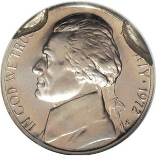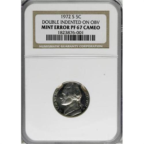 <B>1972-S 5C Jefferson Nickel--Double Indented on Obverse--PR67 Cameo NGC.</B></I> When this proof nickel was struck, apparently two other nickel planchets were also present, and these indented the obverse at 10 o'clock and 1:30. The two indented areas respectively remove 3% and 5% of the obverse design. The reverse is unaffected. A lovely Superb Gem with delicate gold and lilac toning.<BR><BR><b>Shipping:</b> Coins & Currency (<a target="_blank" href="http://www.heritageauctions.com/common/shipping.php">view shipping information</a>\)