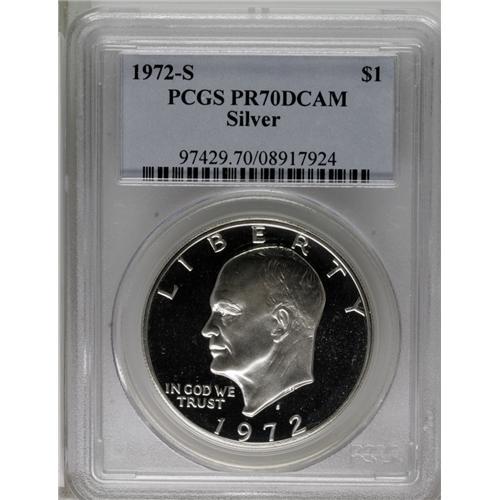 <B>1972-S S$1 Silver PR70 Deep Cameo PCGS.</B></I> A flashy example of this brown-box silver proof issue that has surprisingly strong contrast. Compared to the average circulation-strike Ike, the surfaces of this coin seem preternaturally perfect. PCGS has awarded this grade to just 27 coins (2/07).<BR><BR><b>Shipping:</b> Coins & Currency (<a target="_blank" href="http://www.heritageauctions.com/common/shipping.php">view shipping information</a>)
