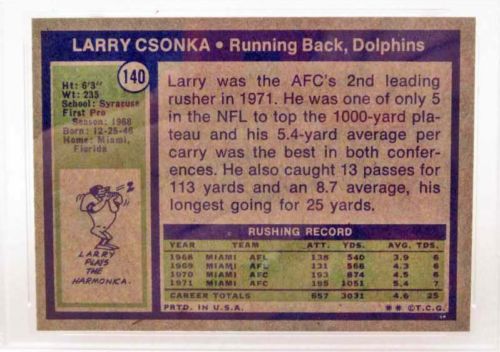 1972 TOPPS #140 LARRY CSONKA FOOTBALL CARD! PSA GRADE 8