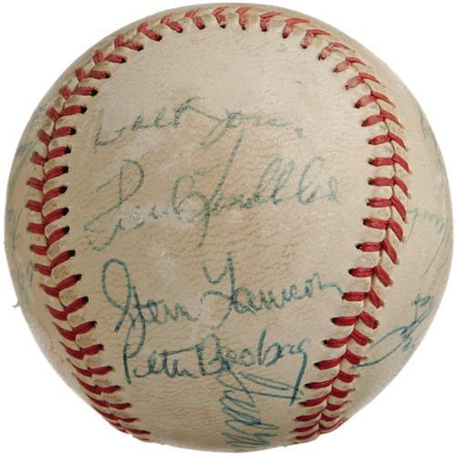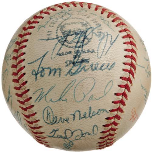 <B>1972 Texas Rangers Team Signed Baseball with Ted Williams.</B></I> Despite nineteen seasons as a player at Fenway, nothing could have prepared Teddy Ballgame for the sort of losing he would encounter at the helm of this hapless squad, who couldn't avoid triple digits in the loss column the year the Washington Senators became the Texas Rangers. This first season in the Lone Star State, and last of Williams in uniform, makes the offered sphere very desirable nonetheless, and the legend's sweet spot blue ink signature is first-rate. Twenty autographs join Williams on this OAL (Cronin) ball, with Howard and Maddox among the more notable names. Some surface abrasions affect a few of the autographs, but quality remains a steady and conservative 8.5/10 average. <I>LOA from PSA/DNA. LOA from James Spence Authentication.</B></I><BR><BR><b>Shipping:</b> Balls, Pucks, etc., Small (<a target="_blank" href="http://www.heritageauctions.com/common/shipping.php">view shipping information</a>)