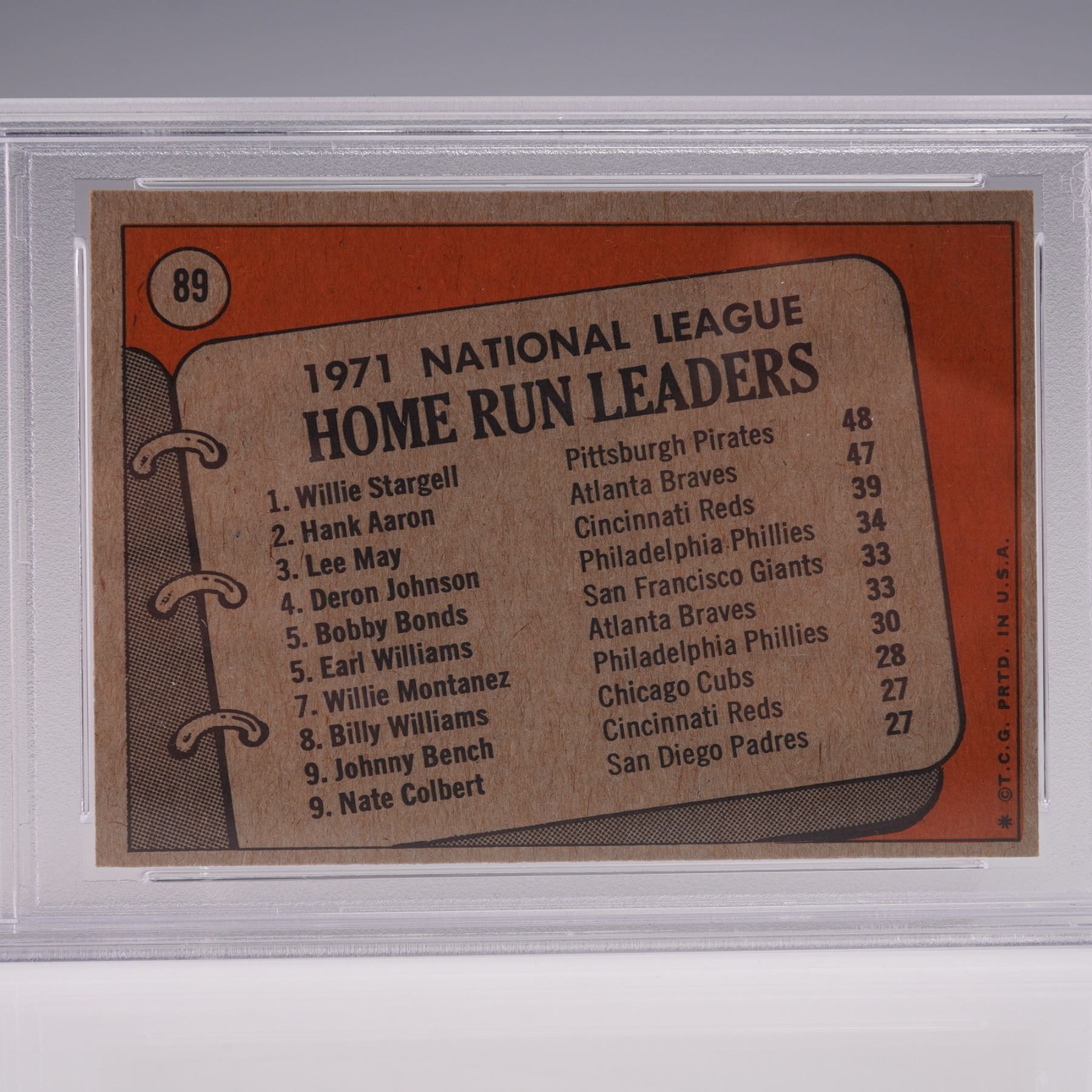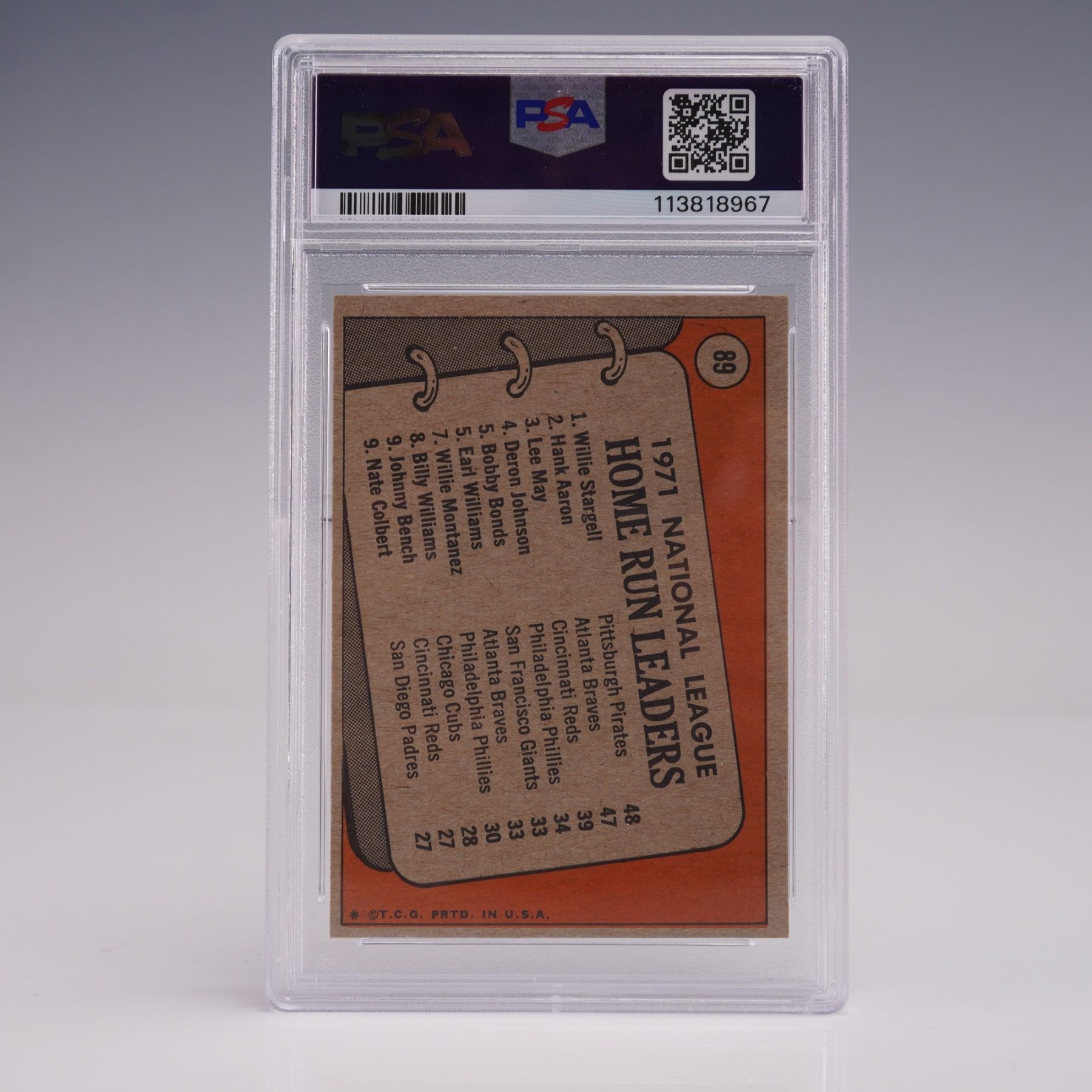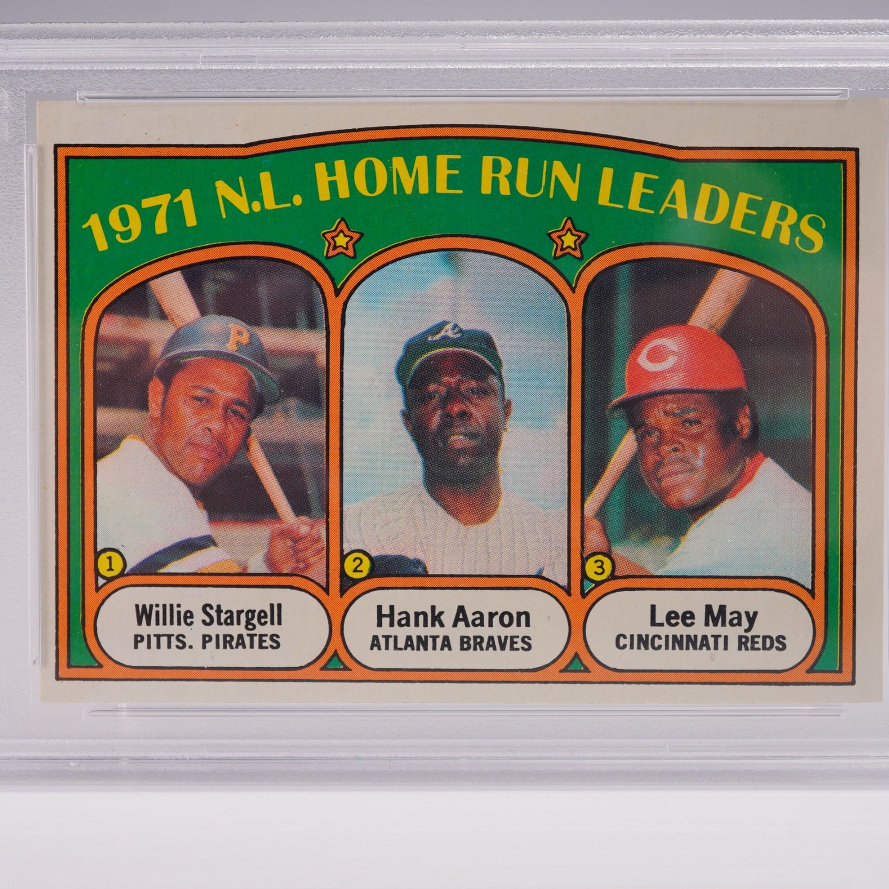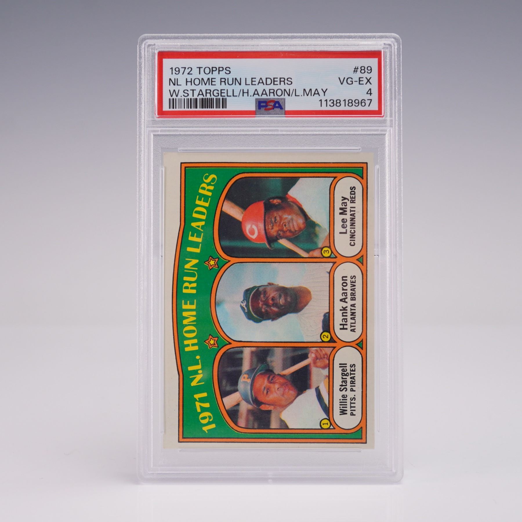 This 1972 Topps #89 National League Home Run Leaders card features three baseball greats: Willie Stargell of the Pittsburgh Pirates, Hank Aaron of the Atlanta Braves, and Lee May of the Cincinnati Reds. It is graded PSA 4 VGEX with certification. The card showcases vibrant colors and classic 1972 Topps design, commemorating the top sluggers of the 1971 season. A fine vintage collectible for Hall of Fame and 1970s baseball card enthusiasts. The PSA slab measures approx. 3.25"L x 5.25"H.