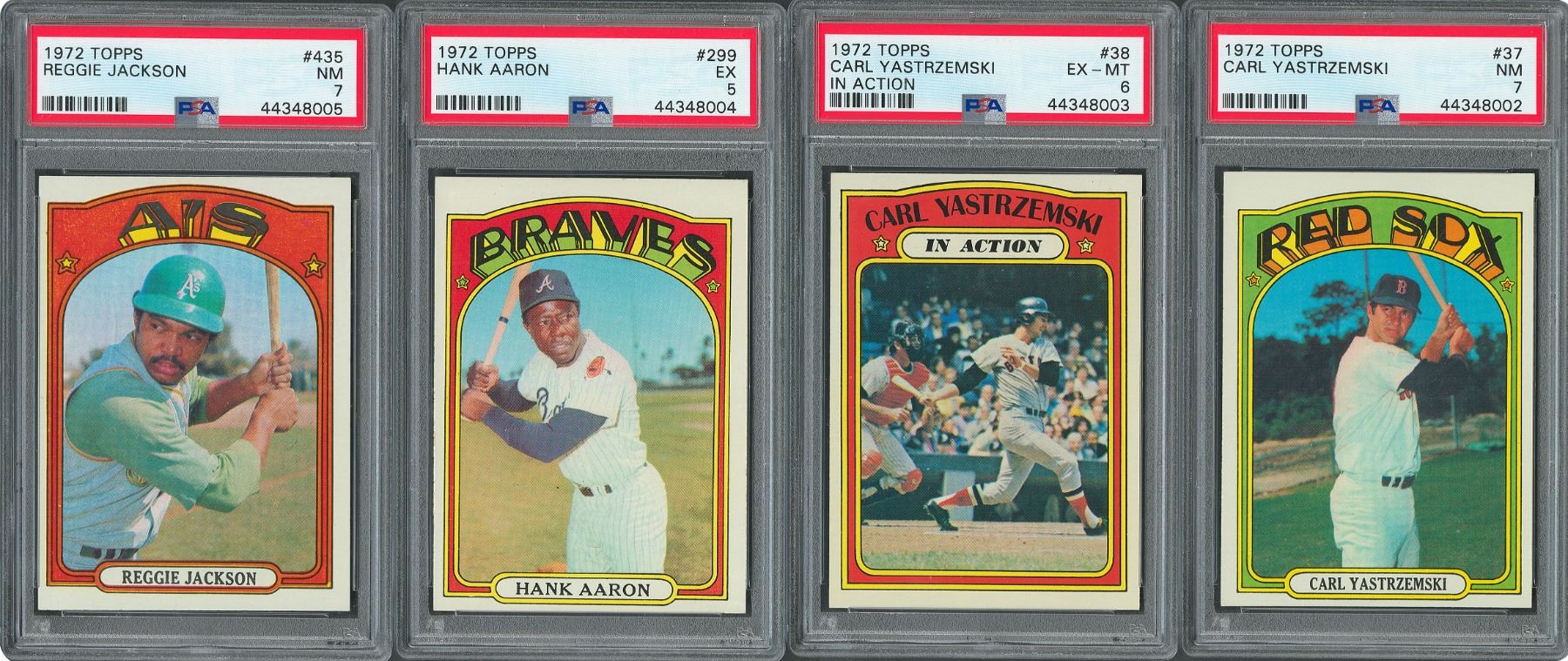 Collection of 200 high grade cards from the 1972 Topps baseball issue, including 58 cards from the high numbers series with many more from the semi-high series. All cards have sharp corners, high gloss, and appear pack fresh. Centering varies, with a few cards miscut. Four cards have been graded by PSA. However, while the group grades EX/MT to NM/MT, there are many more cards ready for 3rd party grading. Contains some stars including #37 Yastrzemski (PSA NM 7), 38 Yastrzemski IA, 51 Killebrew (PSA EX-MT 6), 299 Aaron (PSA EX 5), 435 Jackson (PSA NM 7), and 436 Jackson IA. There are also a few minor Hall of Famers and specials. Nice starter set lot for the high grade collector.
