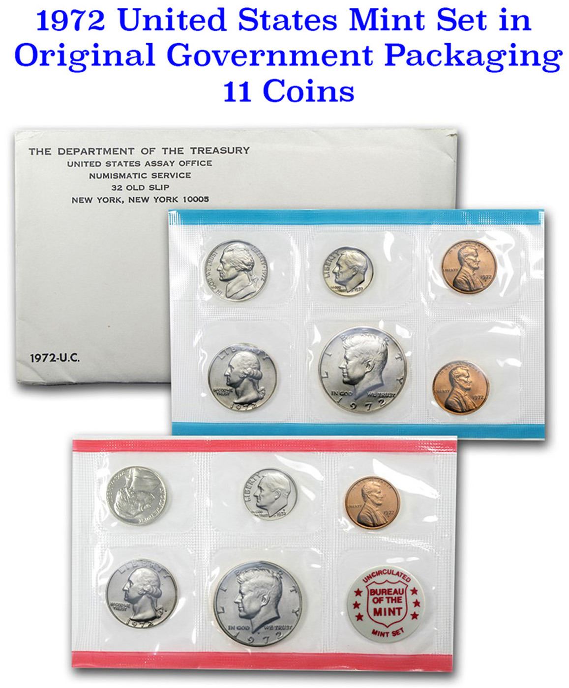 1972 United States Mint Set in Original Government Packaging. Each 1972 Mint Set contained three Lincoln Cents (P, D, S), two Jefferson Nickels (P, D), two Roosevelt Dimes (P, D), two Washington Quarters (P, D), and two Kennedy Half Dollars (P, D). A small plastic disc was also included in each set marked “Bureau of the Mint” and “Uncirculated Mint Set”. The Denver Mint coins and plastic disc were placed in a cellophane marked with a red stripe and the Philadelphia and San Francisco Mint coins were placed in a separate cellophane with a blue stripe. Together they were placed between two cardboard inserts and placed within a white envelope.