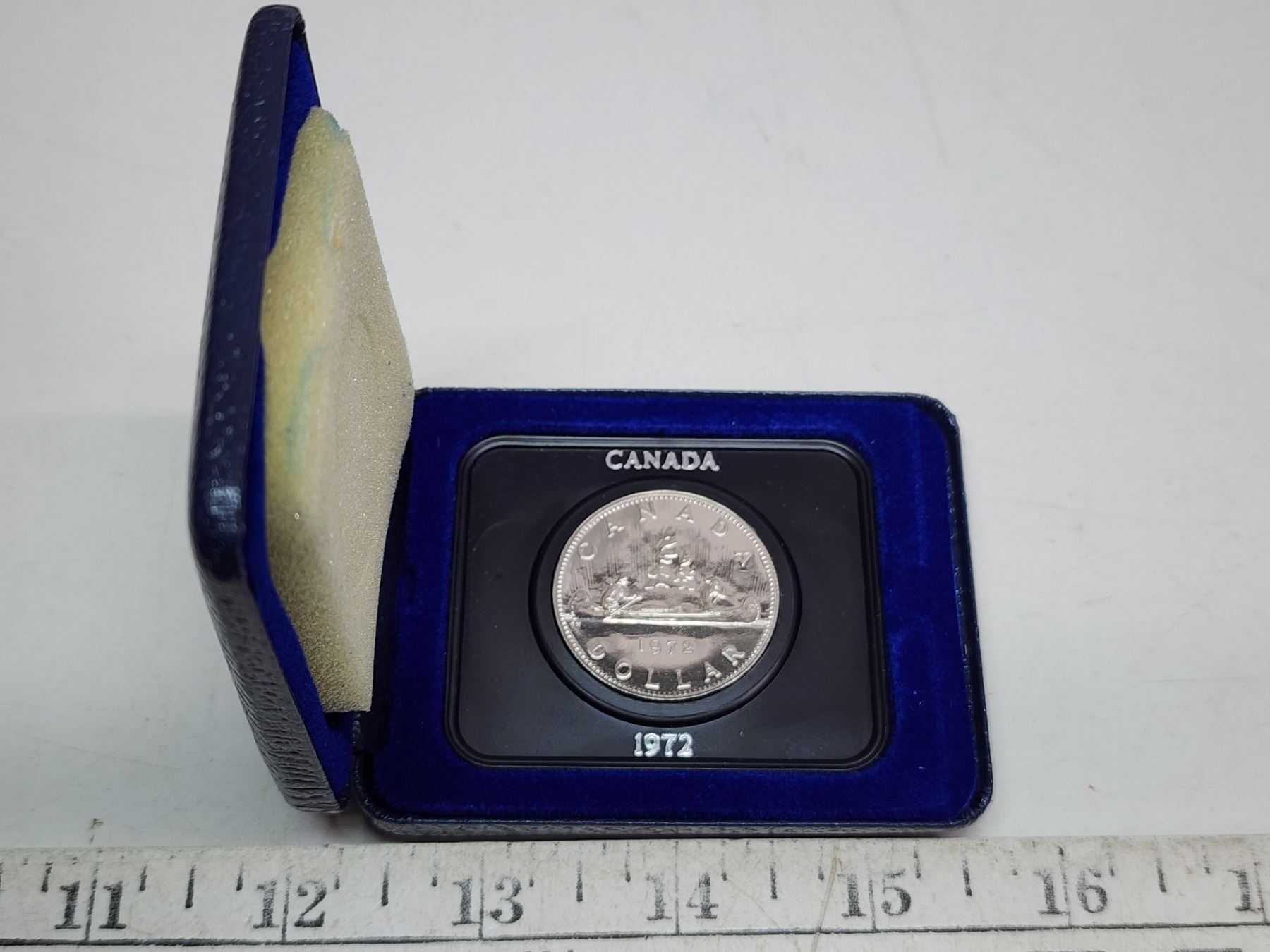 1972 Voyageur Nickel Dollar. Housed in its original blue clamshell case of issue. Specimen. Bright White.