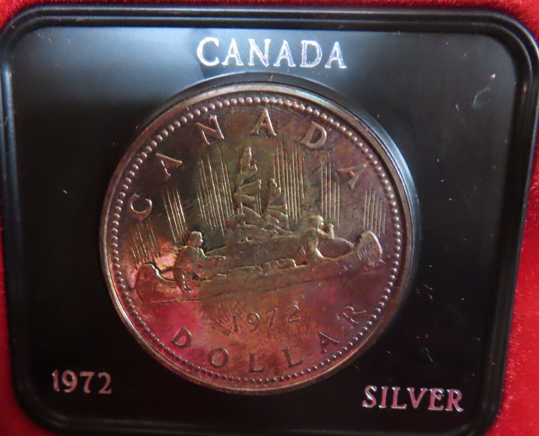 1972 Voyageur Specimen Silver Dollar. Beautifully Toned. Housed in its original black clamshell case of issue.