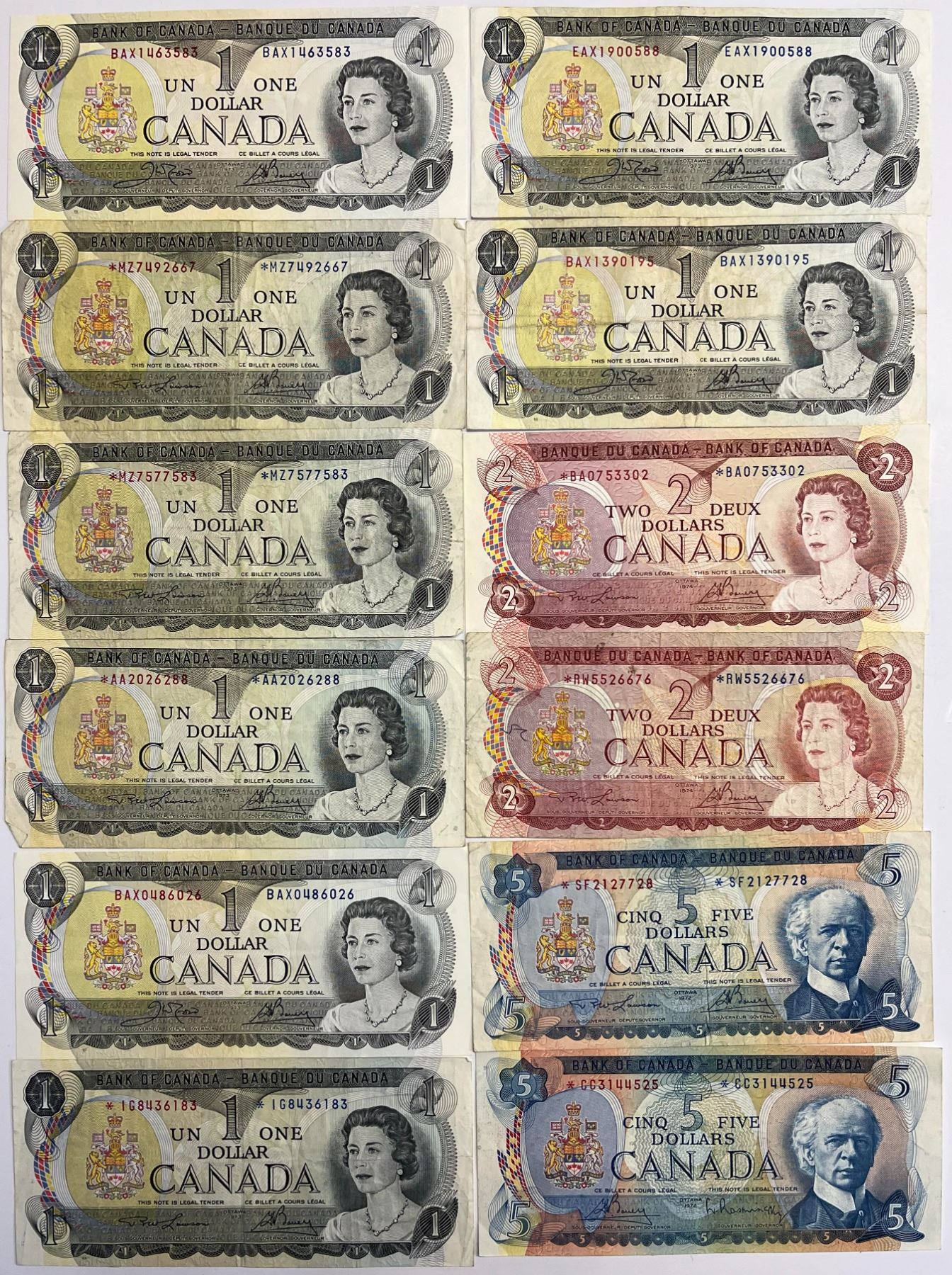 1973 $1, 1974 $2, 1972 $5 Lot of 11 replacement notes VF to Unc. Includes different prefixes.