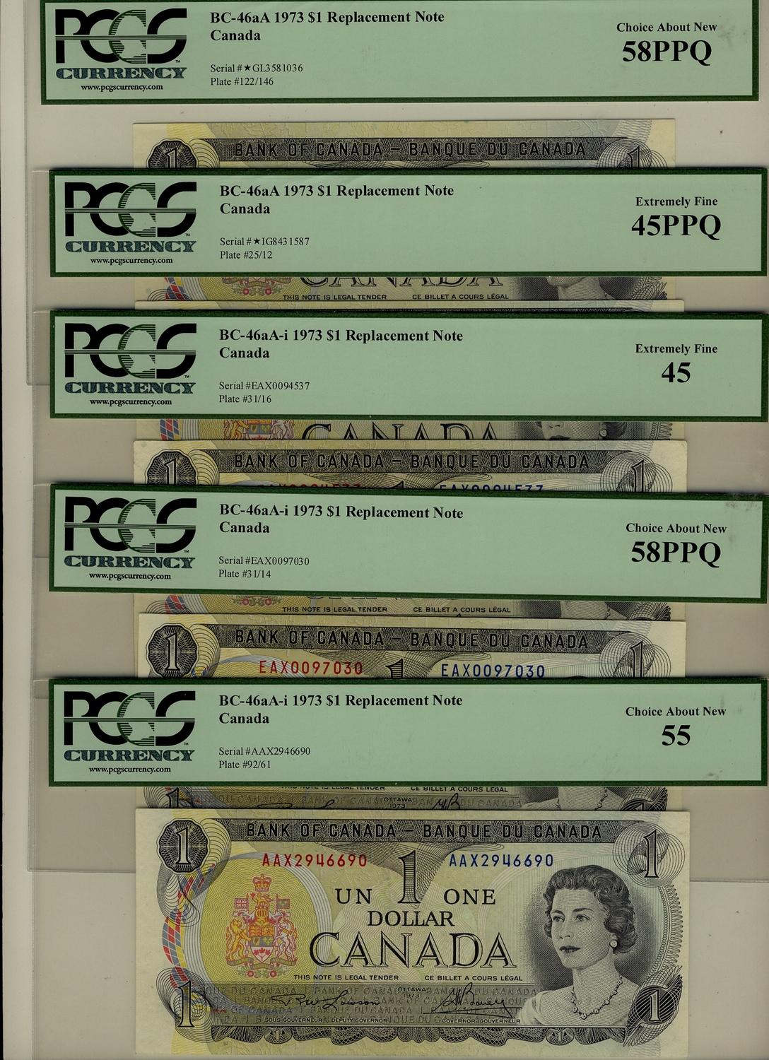 1973 $1 BC-46aA(2) & 46Aa-I(3). Lot of 3 replacement notes all PCGS graded. Includes *IG EF45, *GL AU58, EAX EF45, EAX AU58 & AAX AU55. All Litho's. Three issues with PPQ designation.