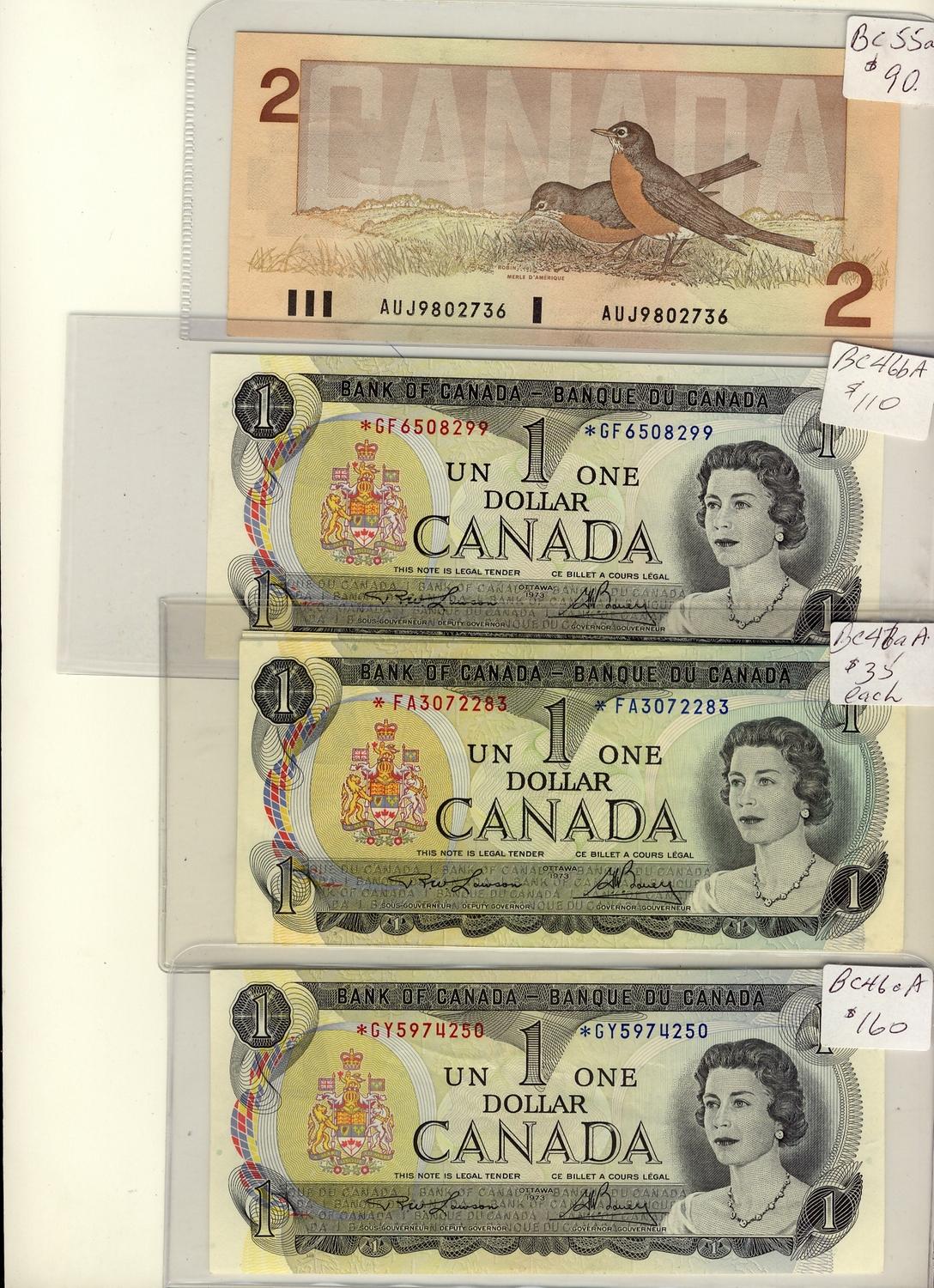 1973 $1 BC-46aA(2) *GY & *FA(6), BC-46bA *GF, also includes 1986 $2 BC-55a #AUJ9802736. Lot of 10 notes EF to UNC.