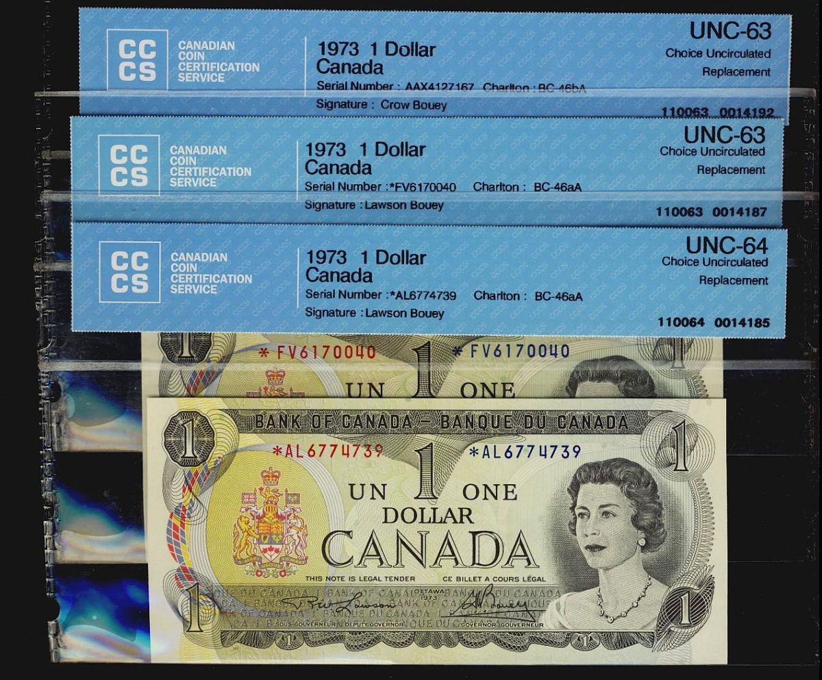 1973 $1 BC-46aA #*AL6774739 UNC-64, #*FV6170040 UNC-63 and #AAX4127167 UNC-63. Lot of three notes all CCCS certified.