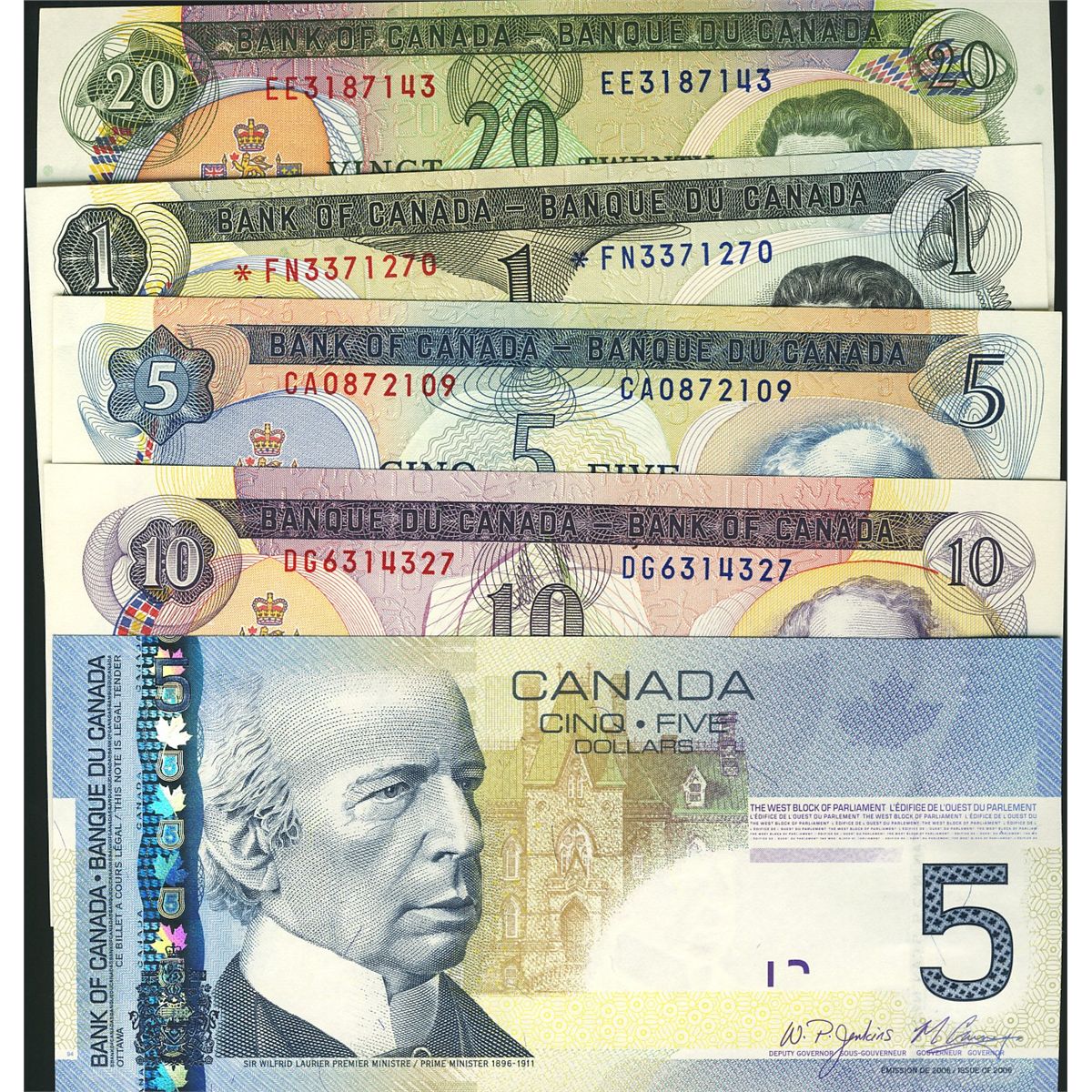 1973 $1 BC-46aA #*FN, 1972 $5 BC-48a, 1971 $10 BC-49a, 1969 $20 BC-50a & 2008 $5 BC-67b #APN0332926. Lot of 5 notes all UNC.