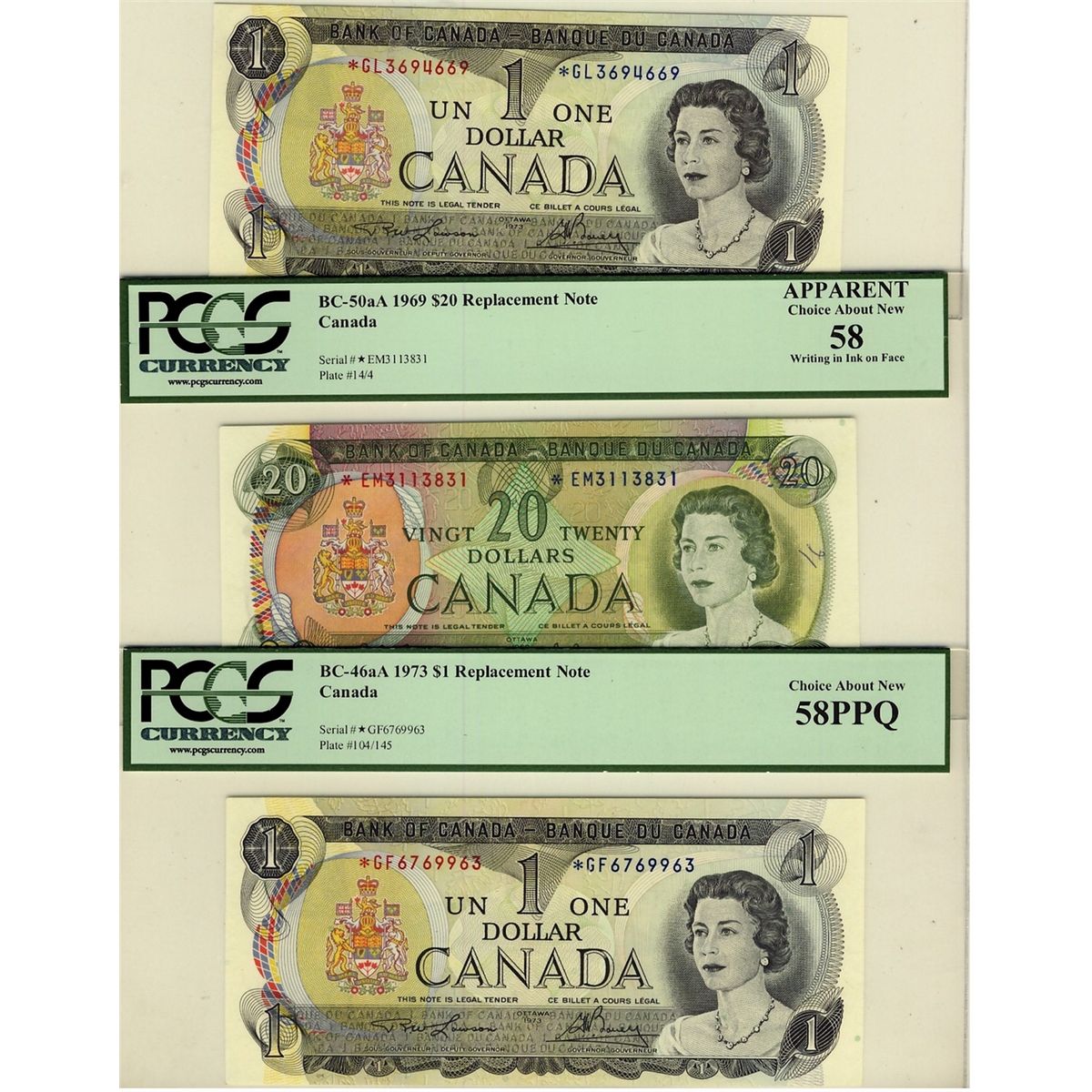 1973 $1 BC-46aA *G/L and *G/F, 1969 $20 Bc-50aa *E/M lot of 3 notes all PCGS AU58.