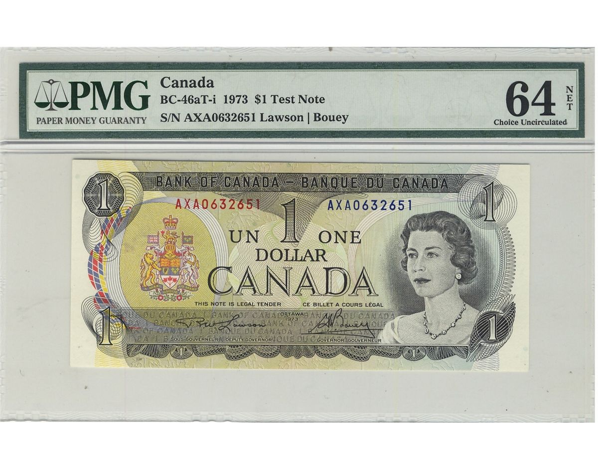 1973 $1 BC-46aT-i Steel Test Note #AXA0632651, PMG CH UNC64 Net. Very tiny nick in bottom border.