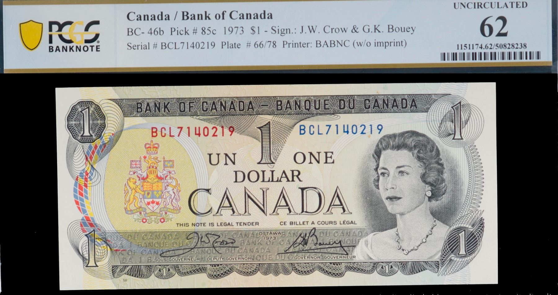 1973 $1 BC-46b (4), 1986 $2 BC-55a. Lot of 6 notes, all PCGS Choice Uncirculated-62 to Gem Uncircul