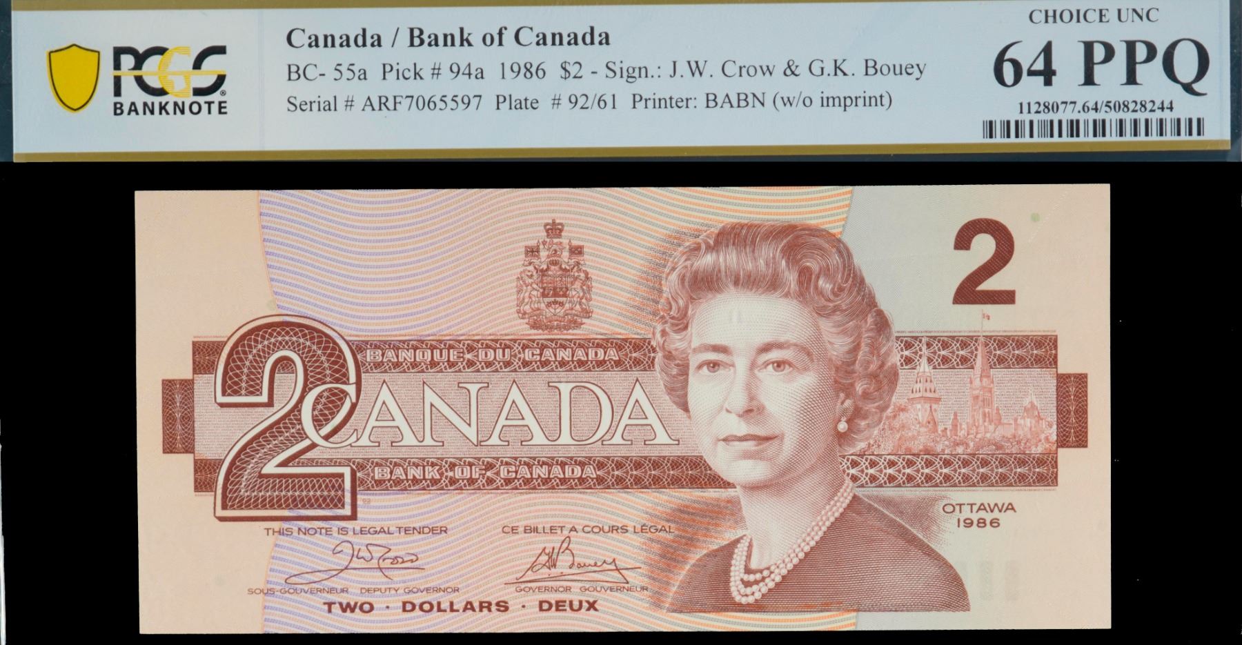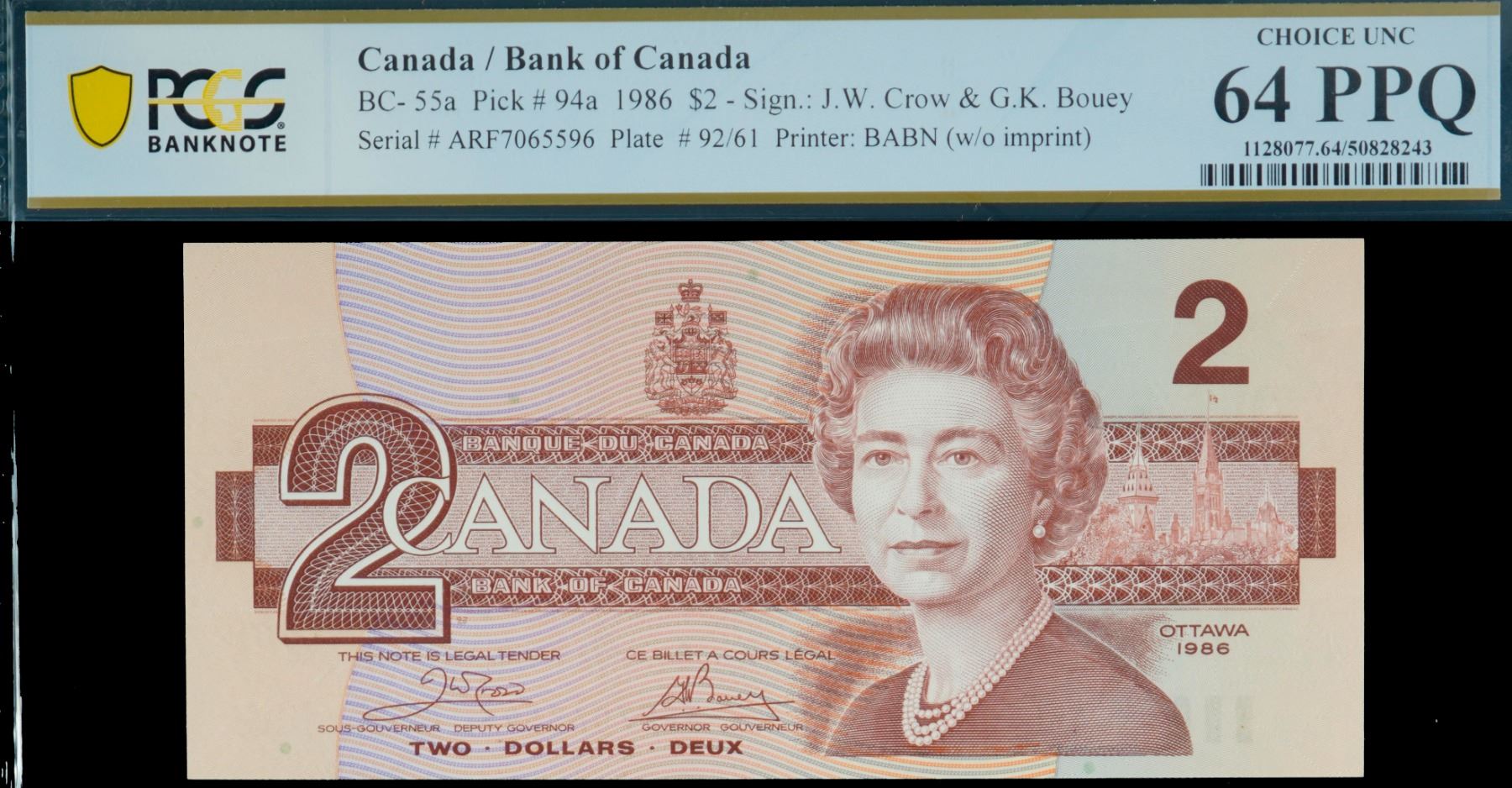 1973 $1 BC-46b (4), 1986 $2 BC-55a. Lot of 6 notes, all PCGS Choice Uncirculated-62 to Gem Uncirculated-65.