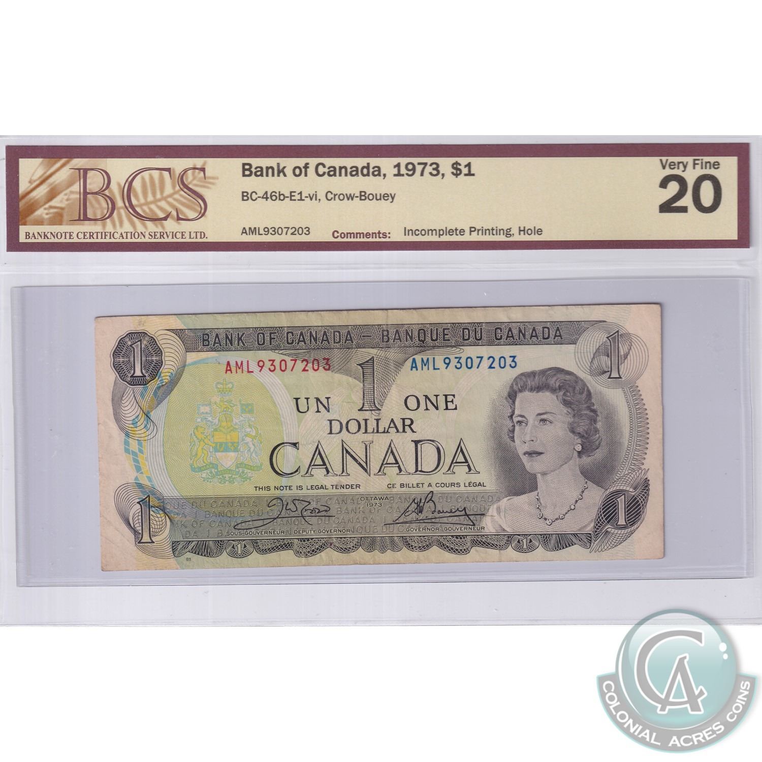 1973 $1 BC-46b-E1-vi, Crow-Bouey, Incomplete Printing, S/N: AML9307203, BCS Certified VF-20 (Hole)