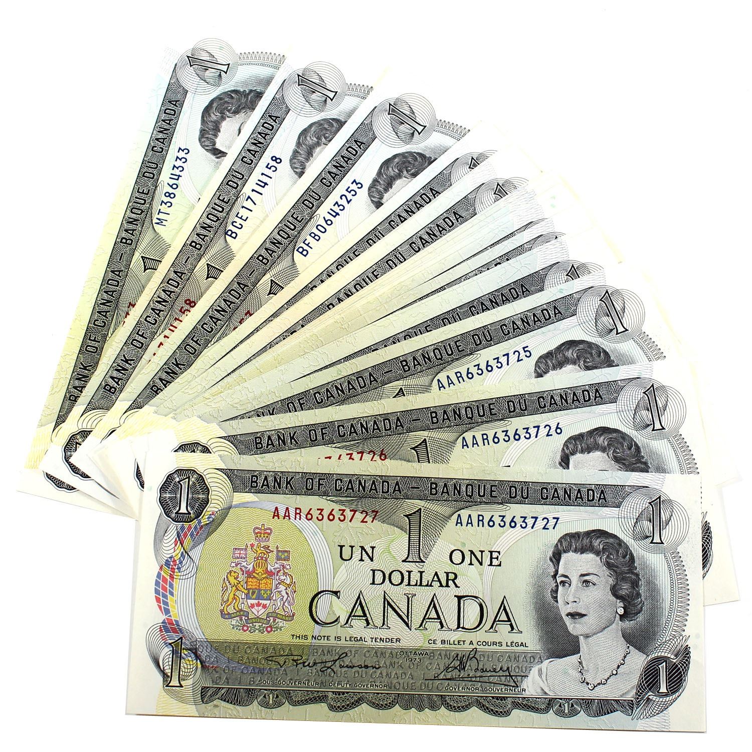 1973 $1 Bank of Canada Notes - 9x Lawson-Bouey & 16x Crow-Bouey UNC+ with Many Different Prefixes. 25pcs