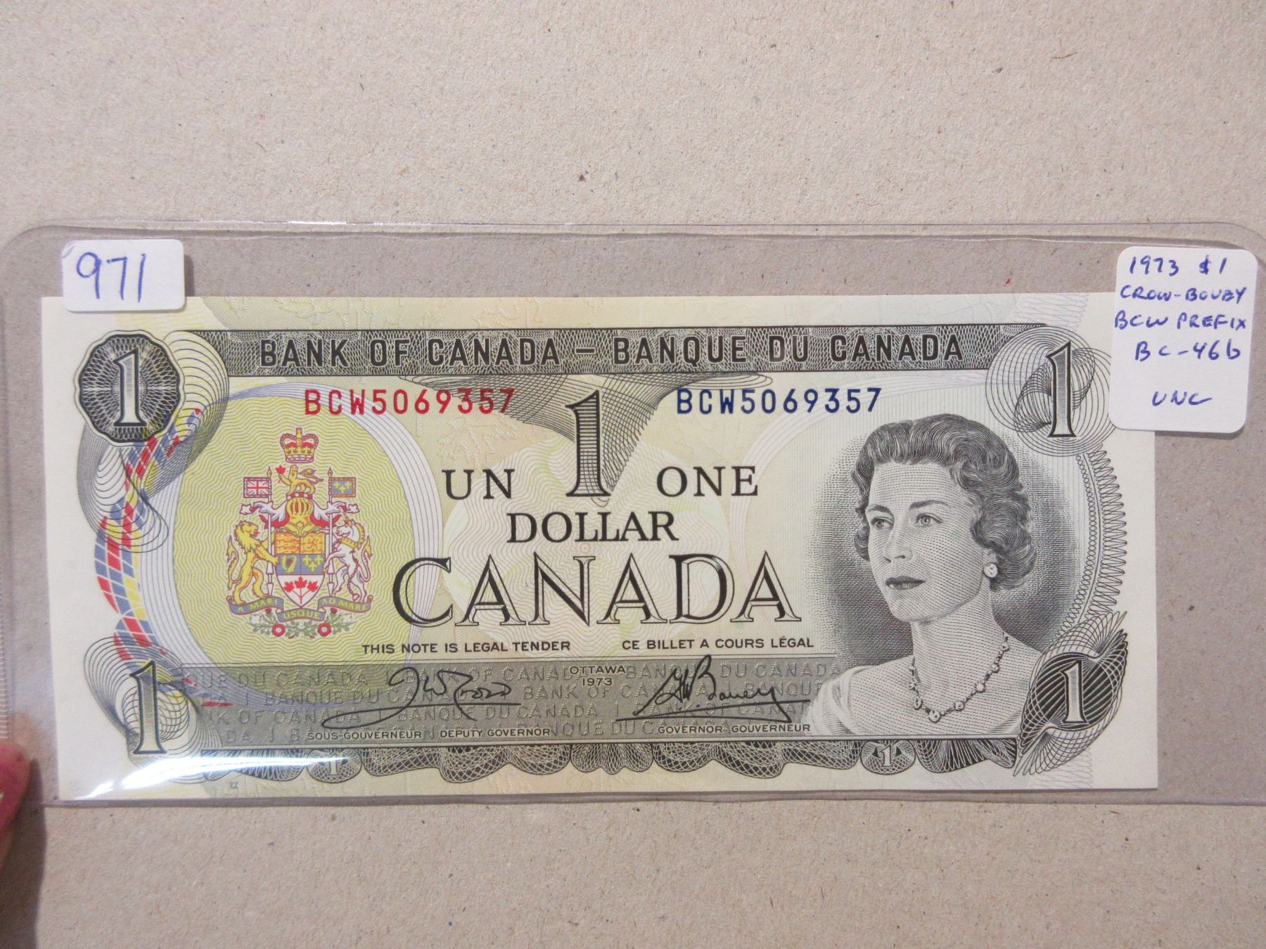 1973 $1. Crow-Bouey signatures. BCW Prefix. BC-46b. Uncirculated.